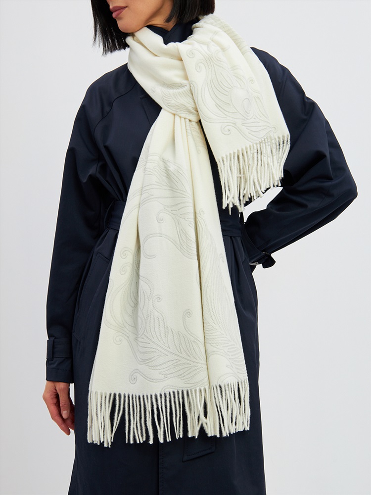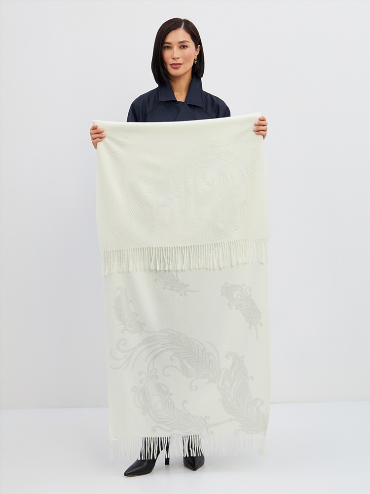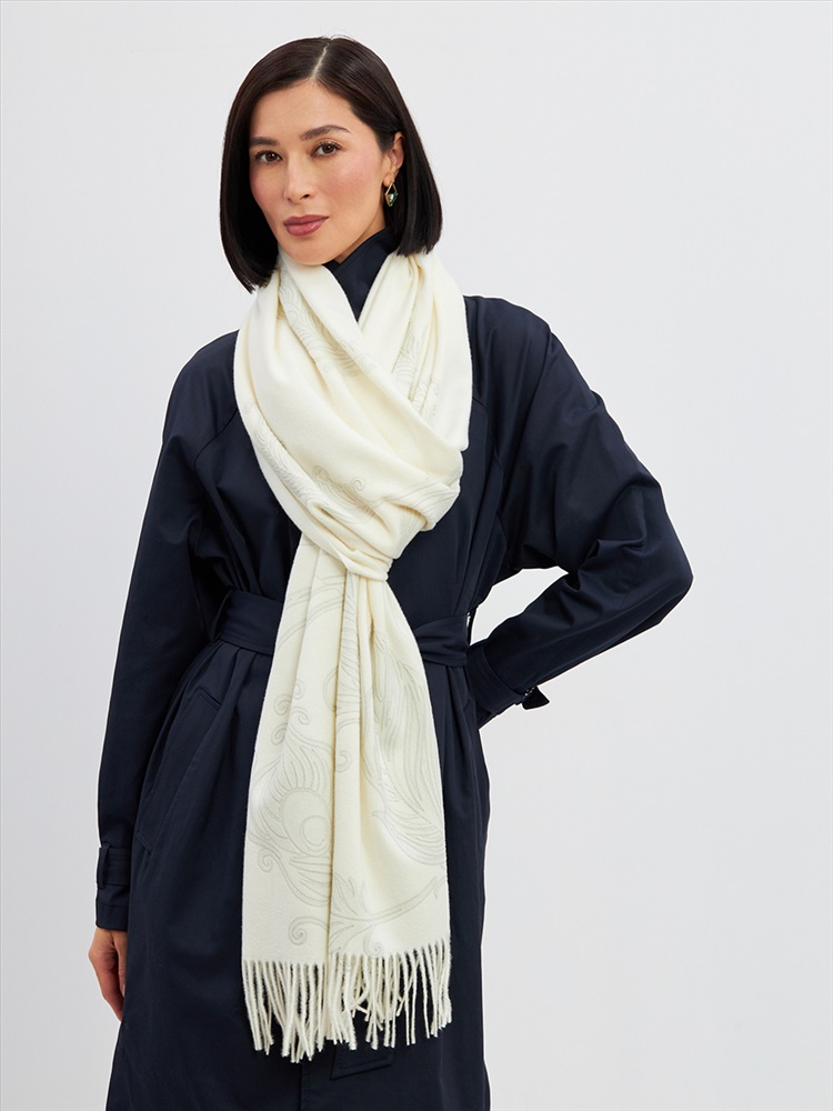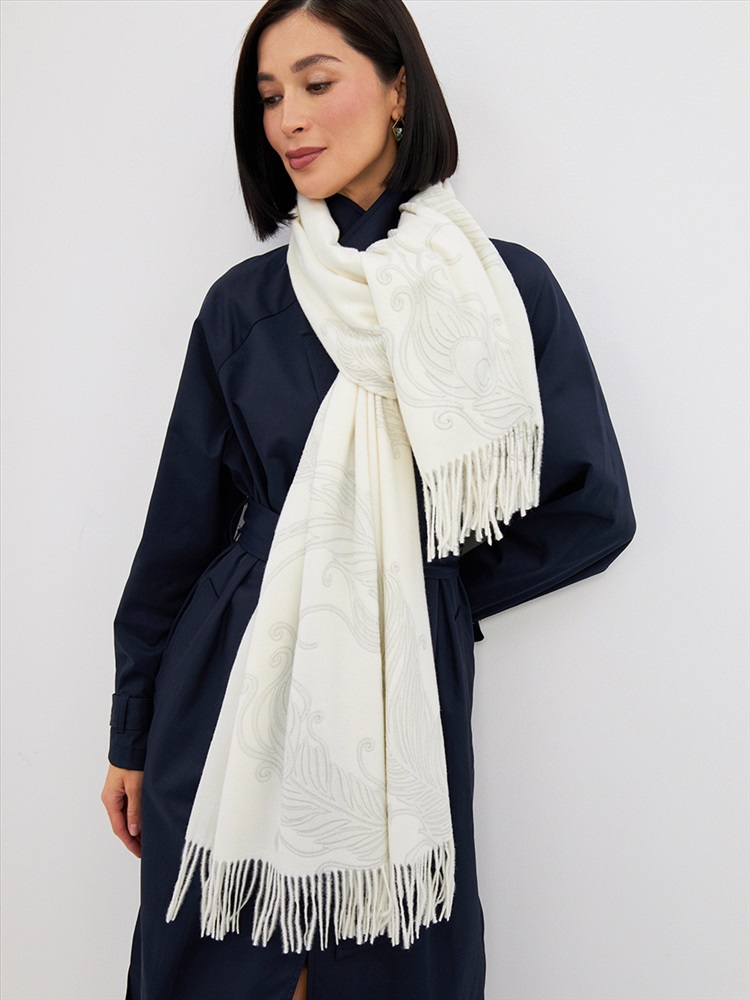 Большой, мягкий, теплый двусторонний однотонный палантин с принтом-печатью. Края изделия украшены бахромой. Машинная деликатная стирка.