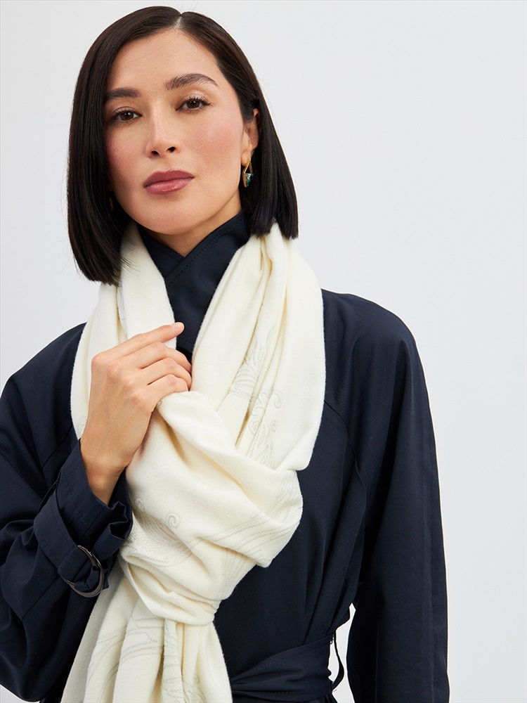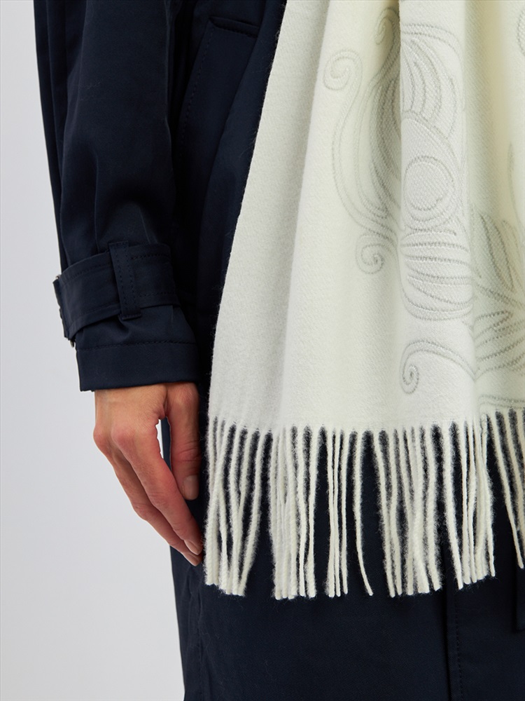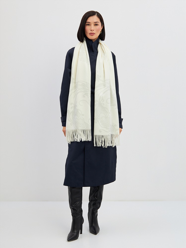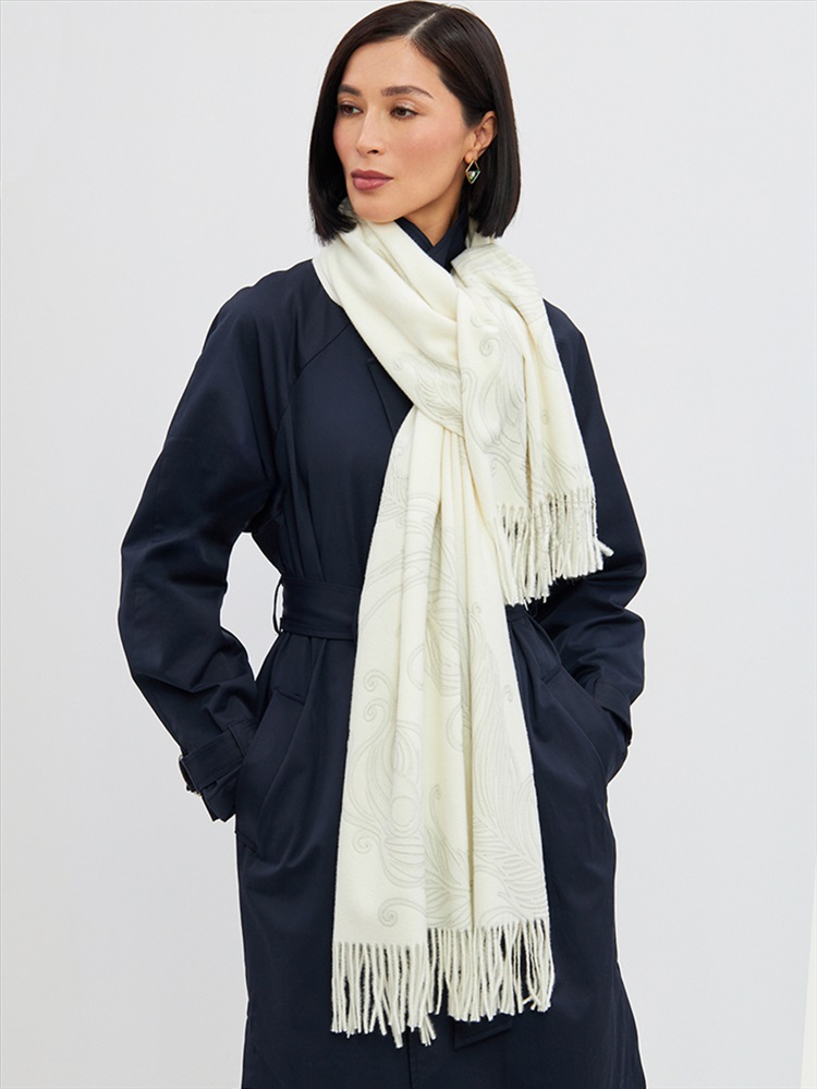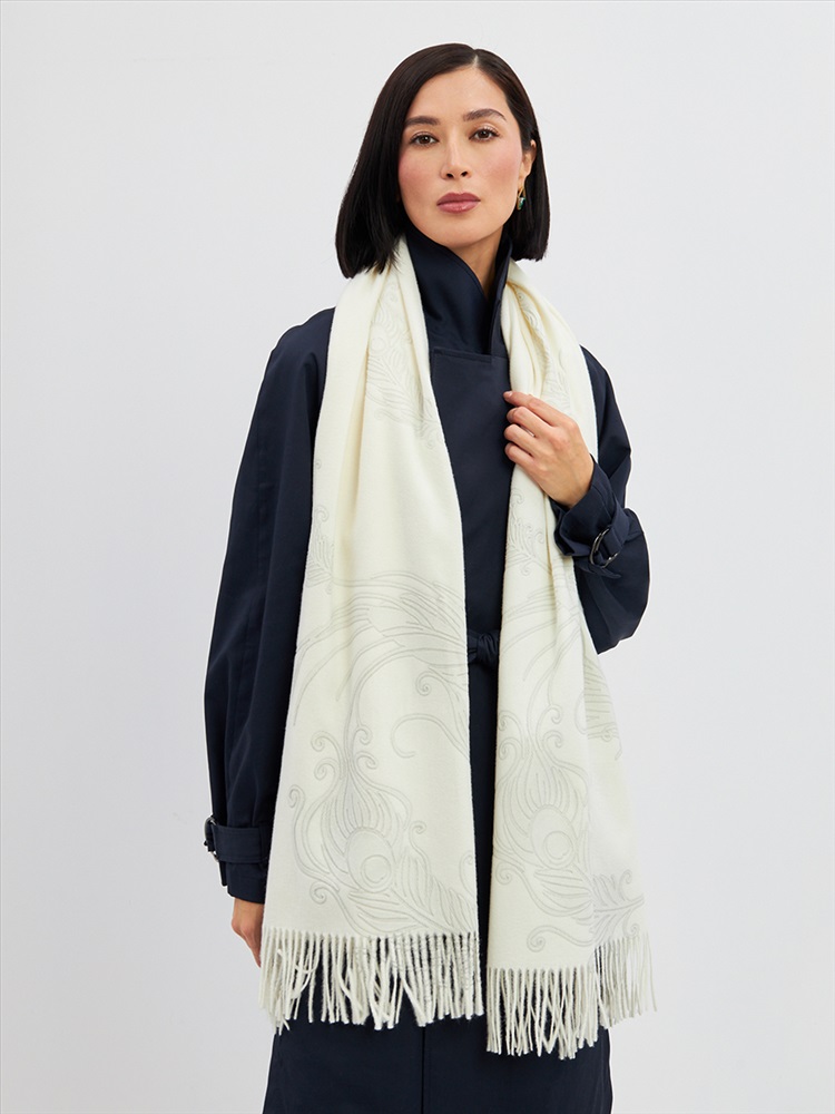 Большой, мягкий, теплый двусторонний однотонный палантин с принтом-печатью. Края изделия украшены бахромой. Машинная деликатная стирка.