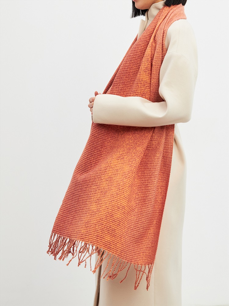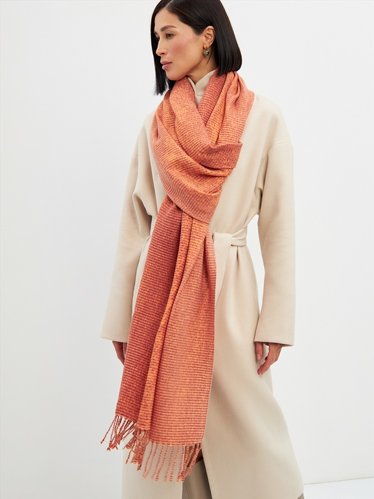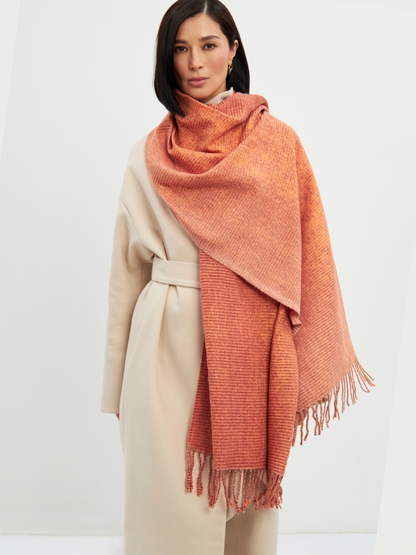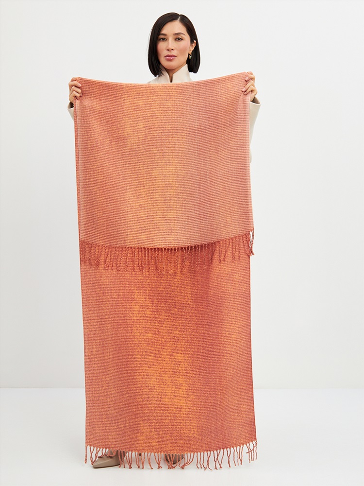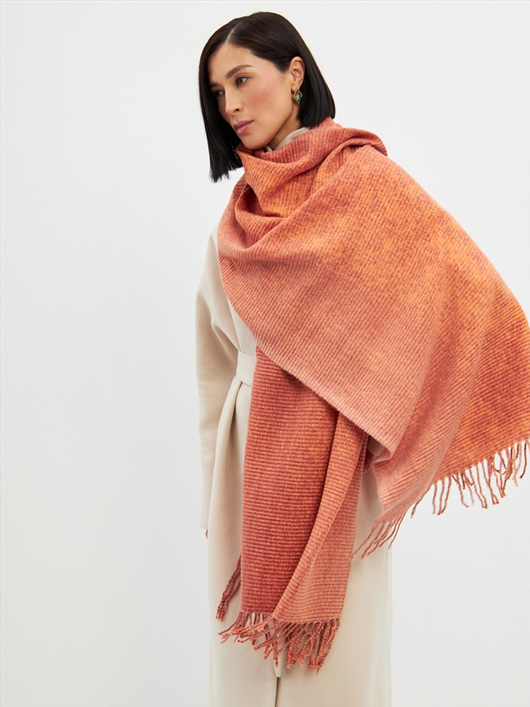 Большой, мягкий, теплый двусторонний однотонный палантин с градиентом переход тона. Края изделия украшены бахромой. Машинная деликатная стирка.