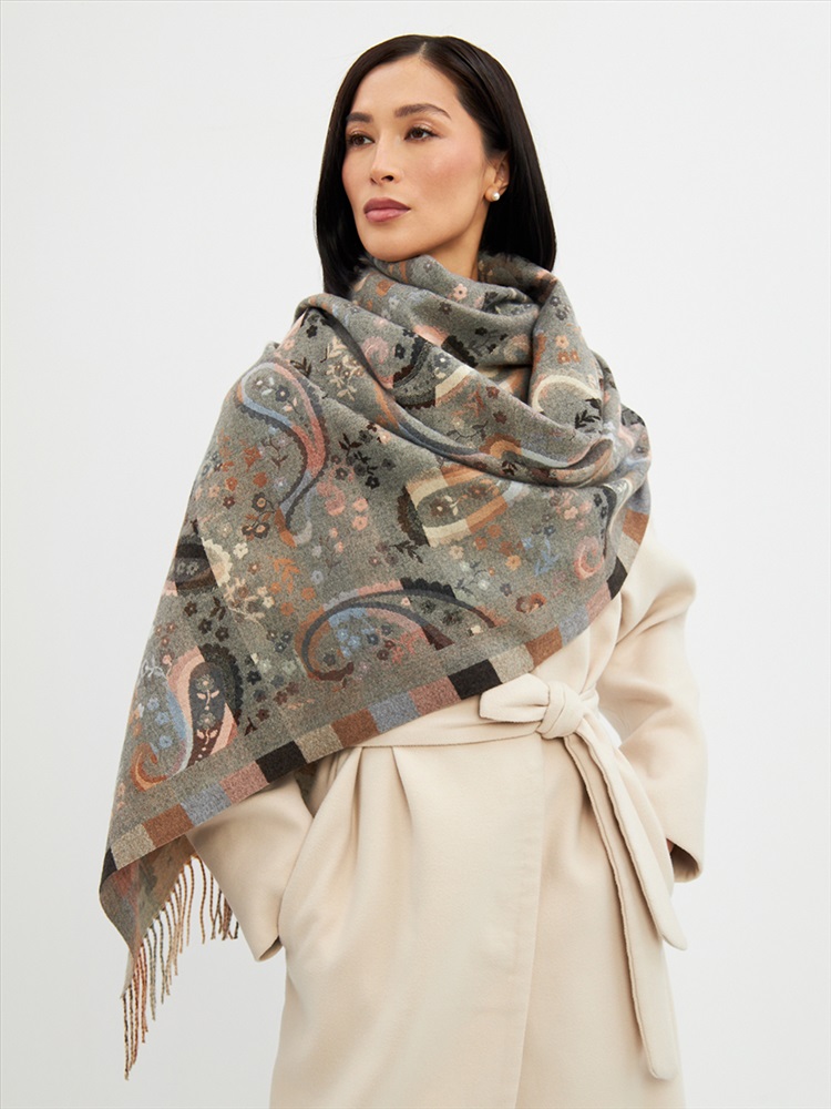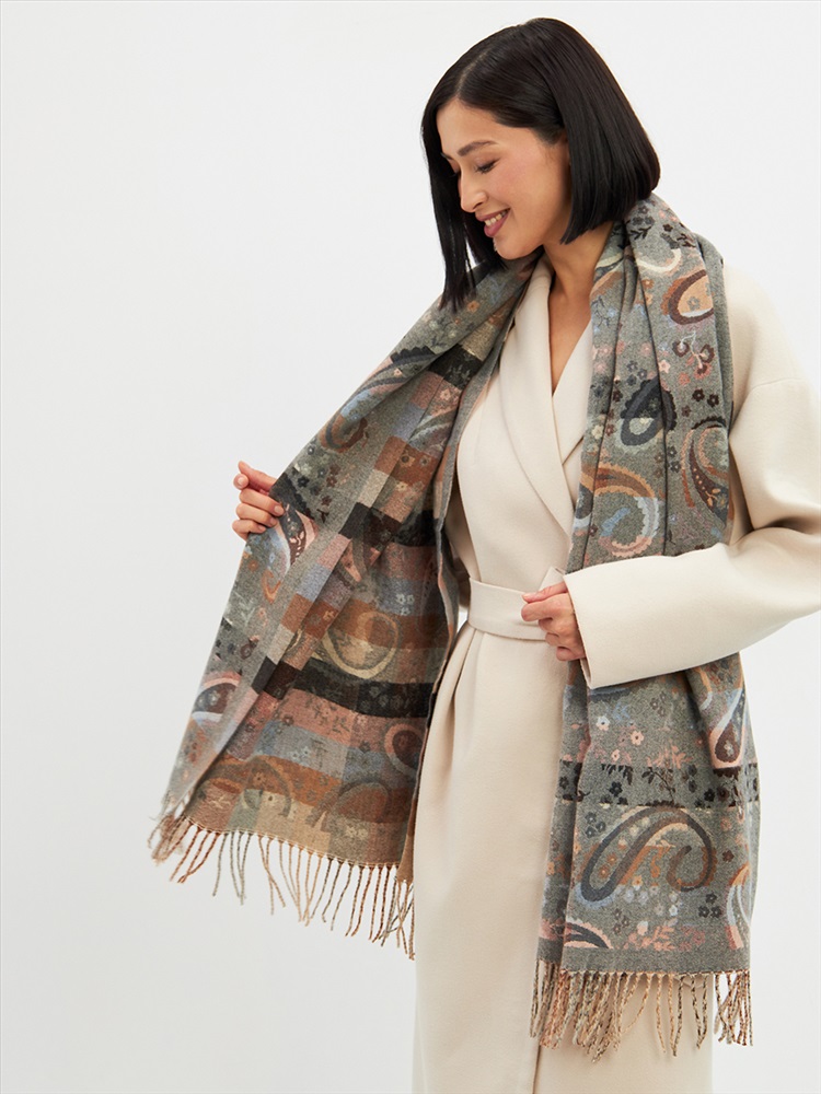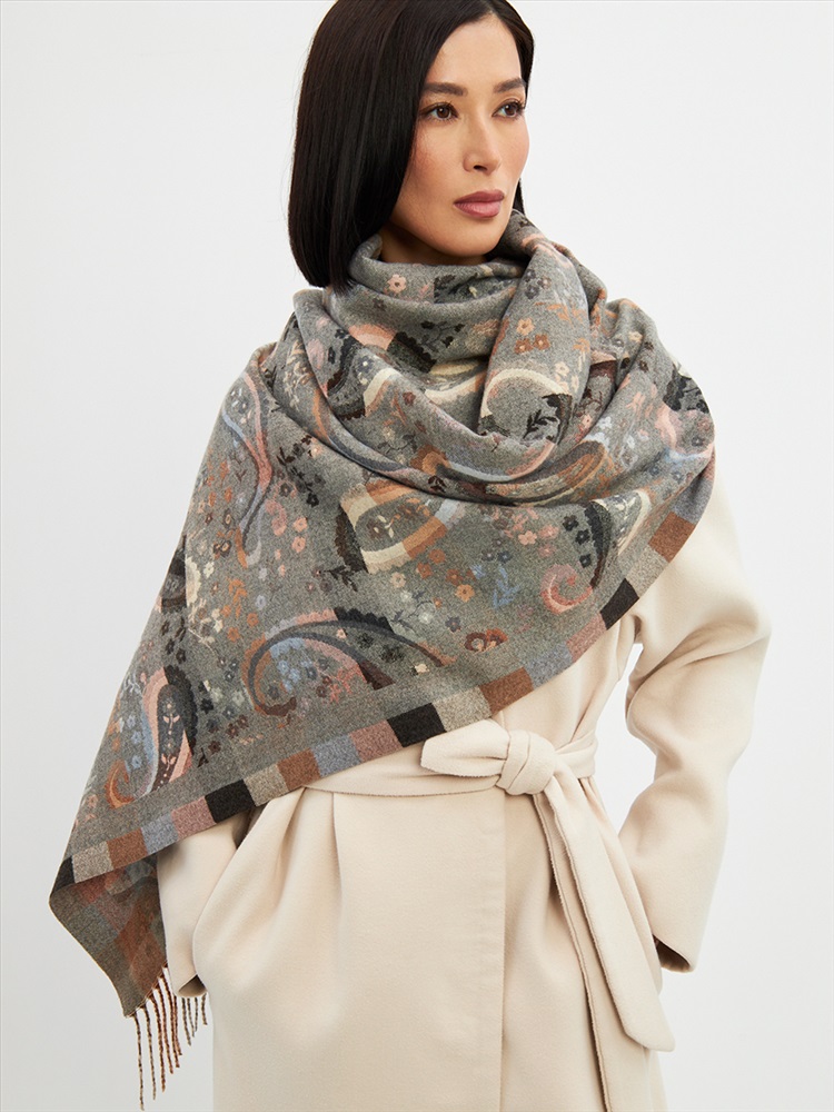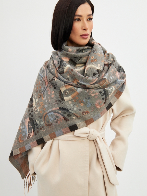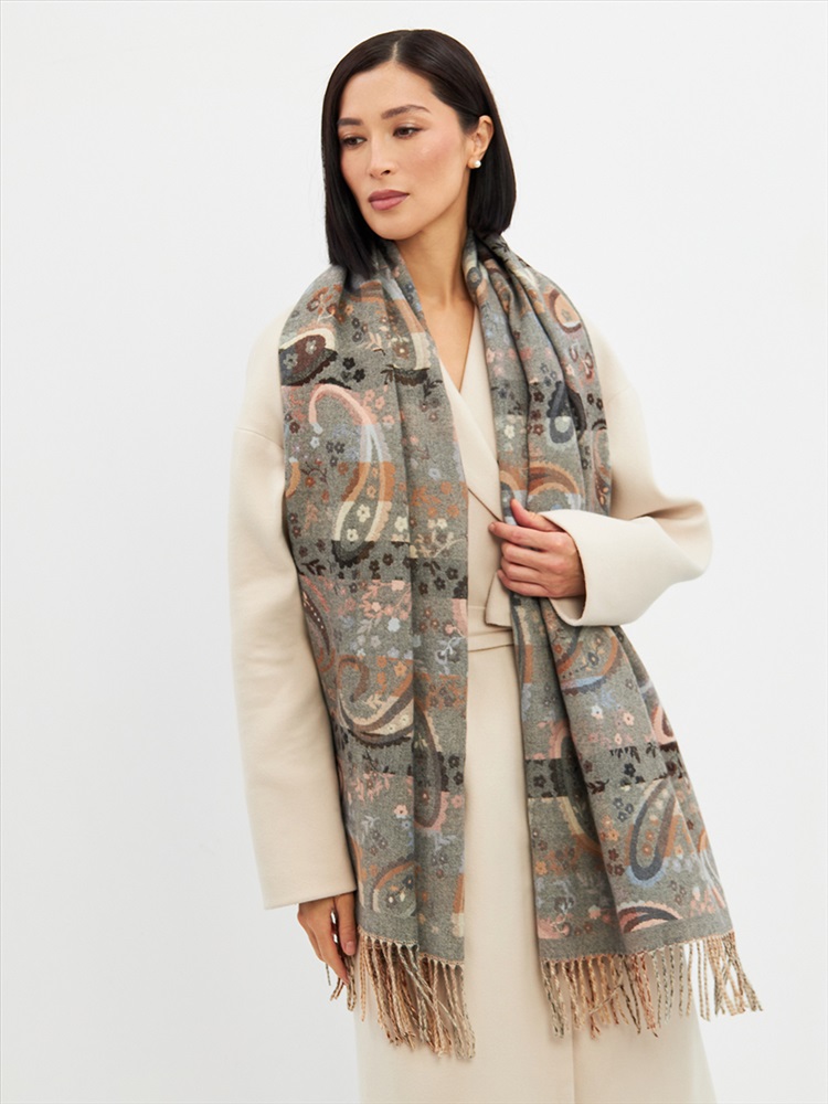 Цвет: Серый Состав: 55% вискоза, 25% кашемир, 20% шерсть Состав: Вискоза, Шерсть, Кашемир Размер: 70 x 180 см Принт: Орнаментальный Большой, мягкий, тонкий и очень нежный палантин с рисунком. Края изделия украшены бахромой ручной работы. Машинная деликатная стирка. Комментарии к товару