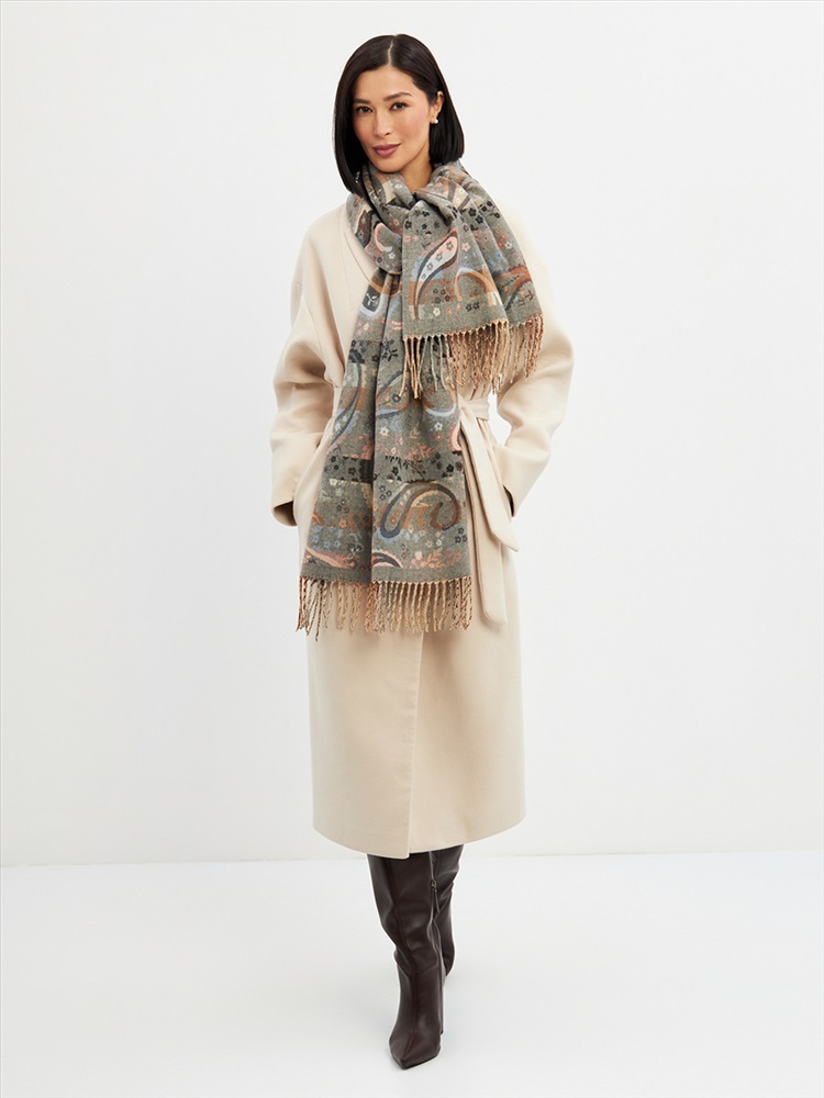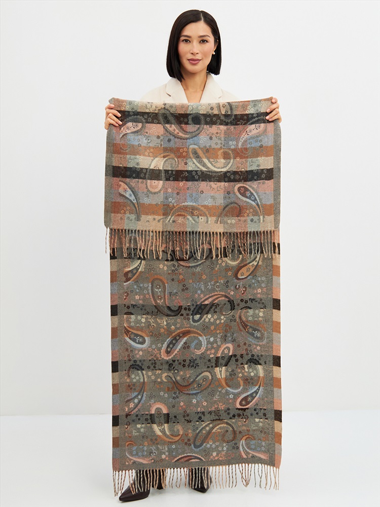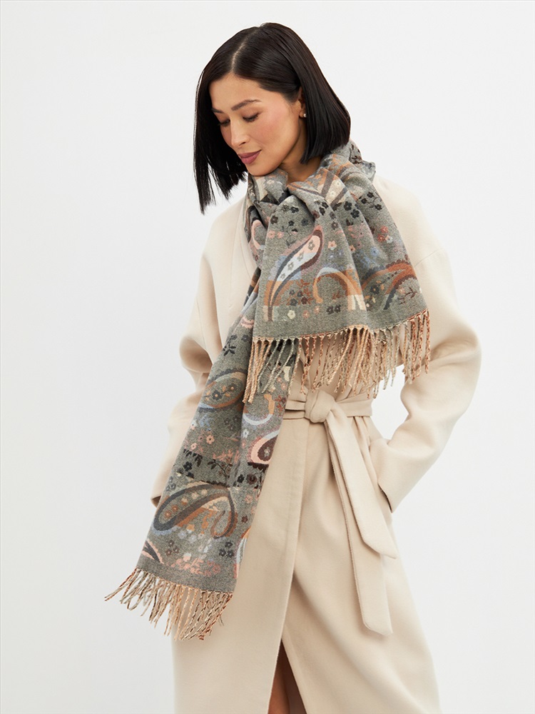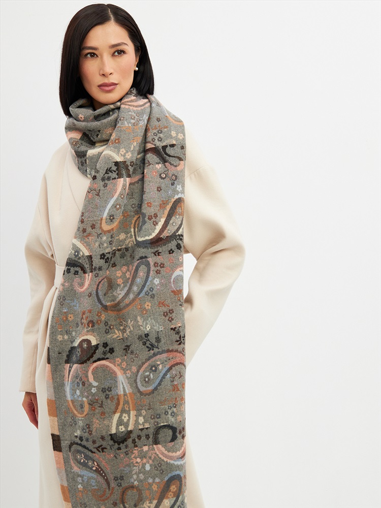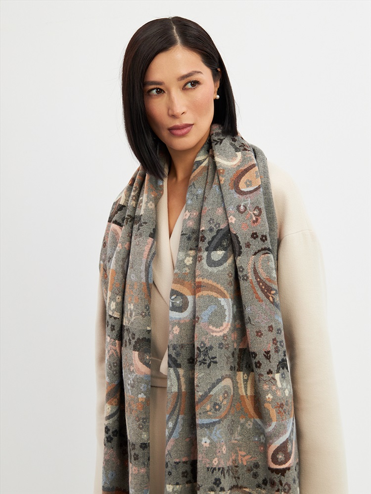 Цвет: Серый Состав: 55% вискоза, 25% кашемир, 20% шерсть Состав: Вискоза, Шерсть, Кашемир Размер: 70 x 180 см Принт: Орнаментальный Большой, мягкий, тонкий и очень нежный палантин с рисунком. Края изделия украшены бахромой ручной работы. Машинная деликатная стирка. Комментарии к товару