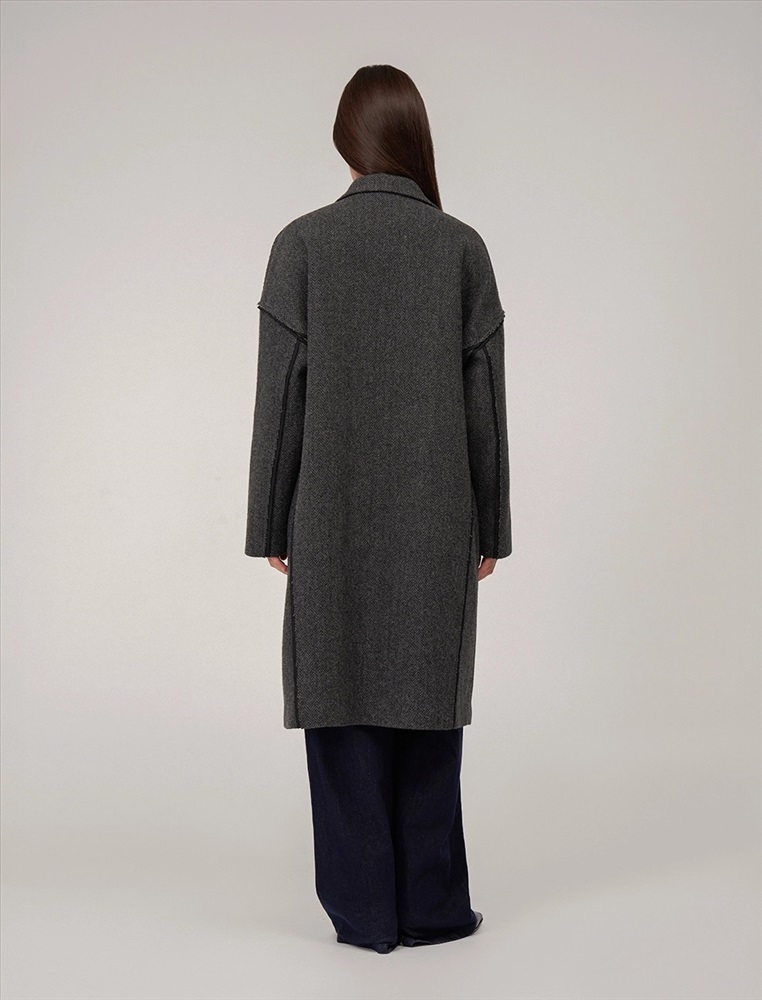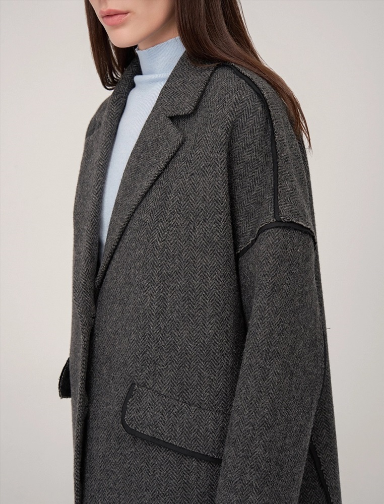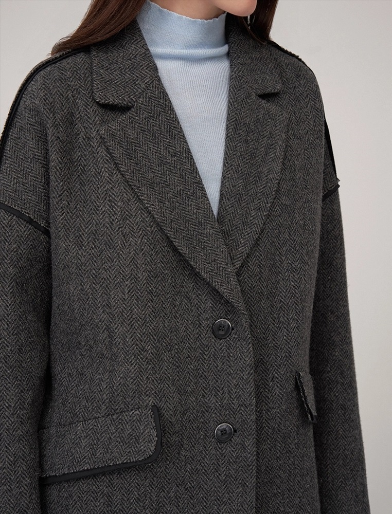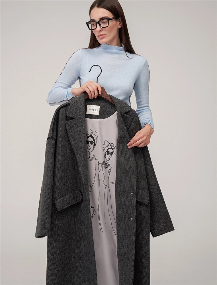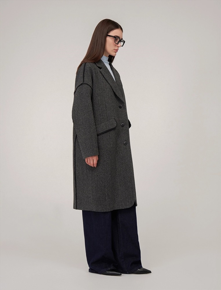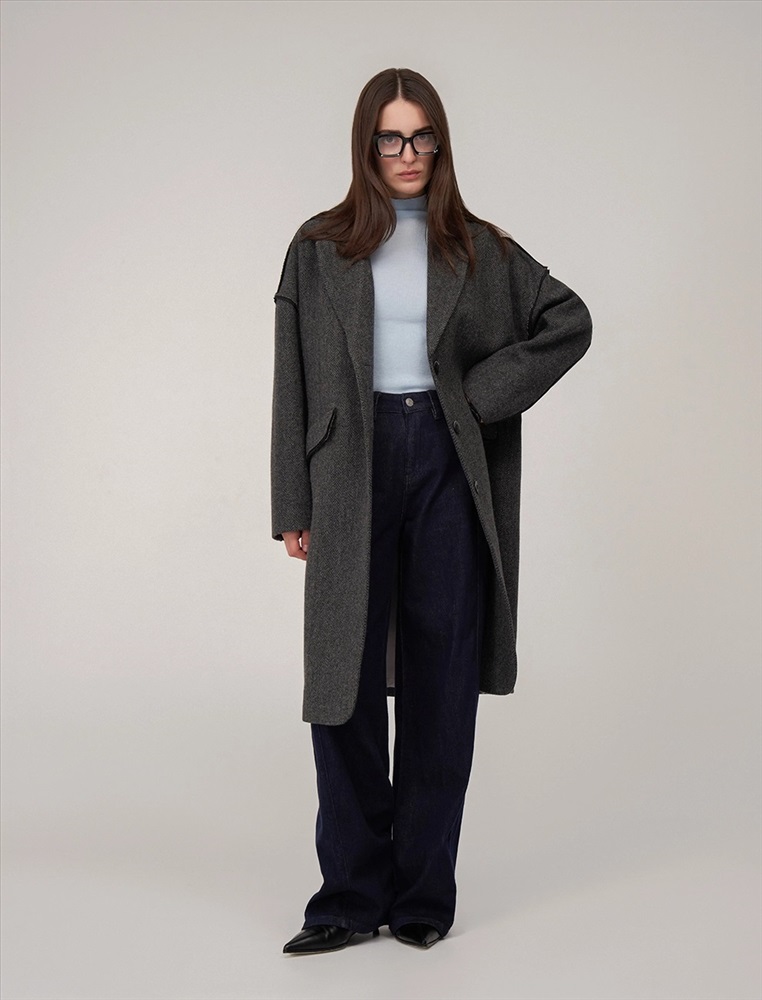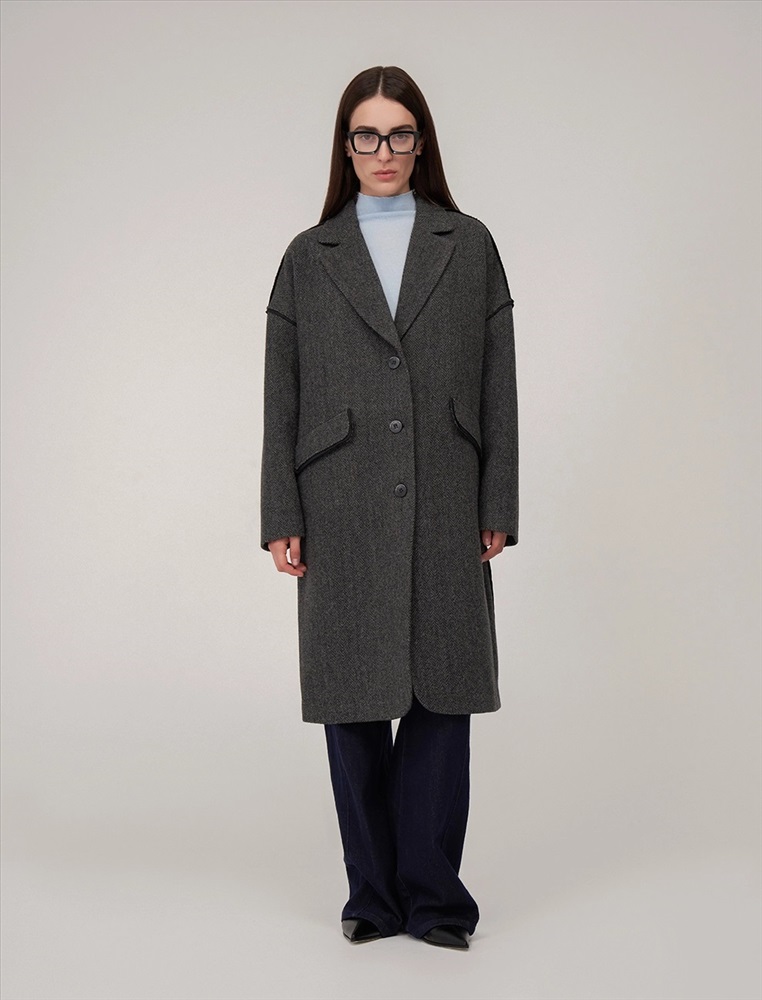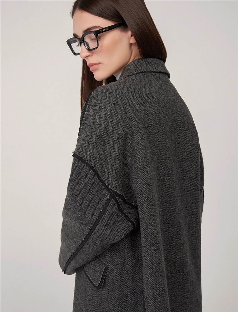 Однобортное пальто силуэта oversize со спущенной линией плеча. По передней части — лацканы, застежка на пуговицы и карманы с клапаном. Края клапанов, проймы и плечевого шва имеют контрастную окантовку и эффект открытых срезов. Ткань верха выполнена из 100% шерсти. Подкладка выполнена из терилена и хлопка.