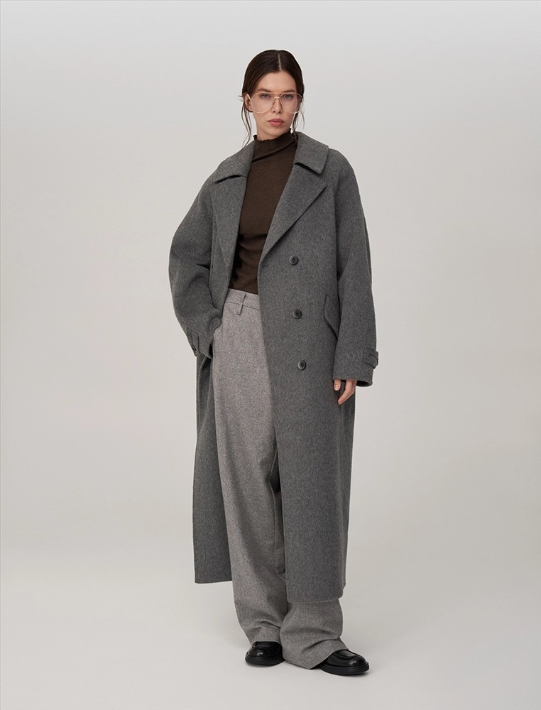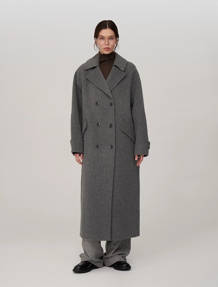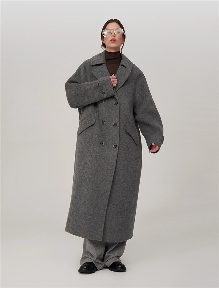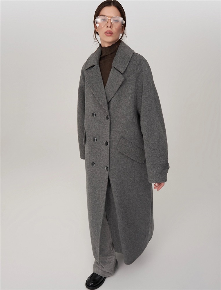 Длинное двубортное пальто О-образного силуэта с большими лацканами и рукавами по типу реглан. По передней части изделия застежка на пуговицы и карманы с клапанами. По низу рукавов хлястики, застегивающиеся на пуговицы. Выполнено из 100% шерсти. Представлено в благородном сером оттенке.