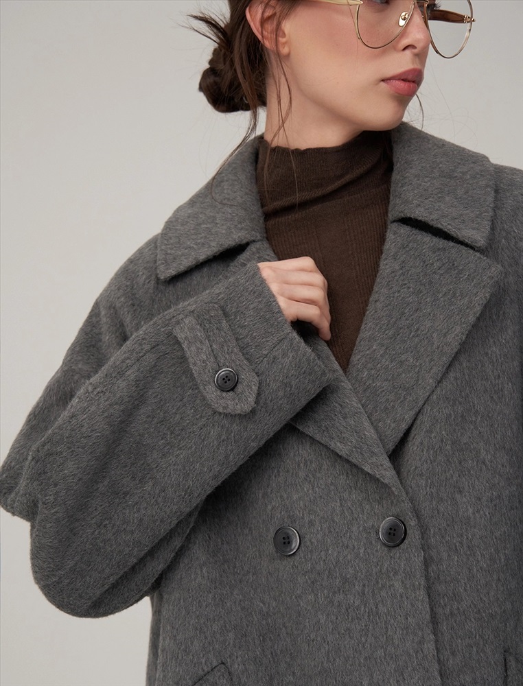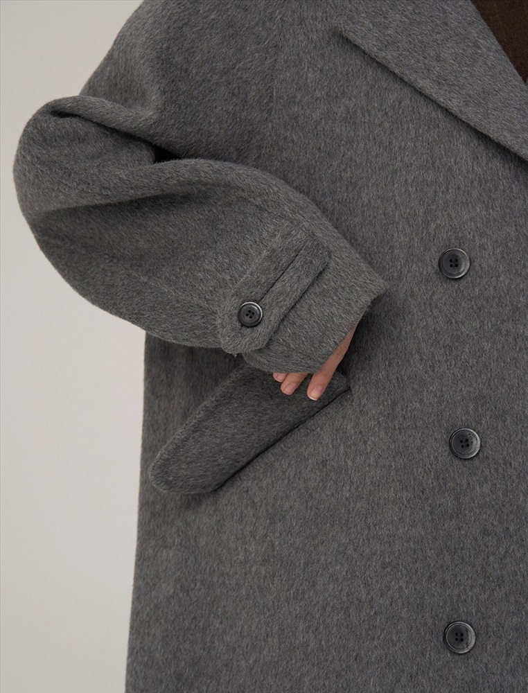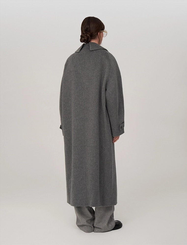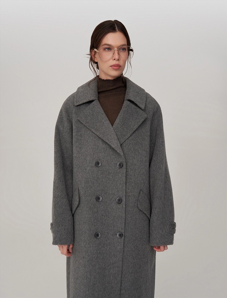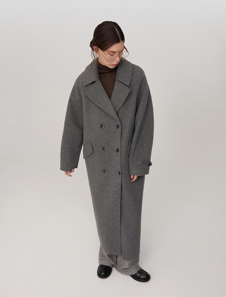 Длинное двубортное пальто О-образного силуэта с большими лацканами и рукавами по типу реглан. По передней части изделия застежка на пуговицы и карманы с клапанами. По низу рукавов хлястики, застегивающиеся на пуговицы. Выполнено из 100% шерсти. Представлено в благородном сером оттенке.