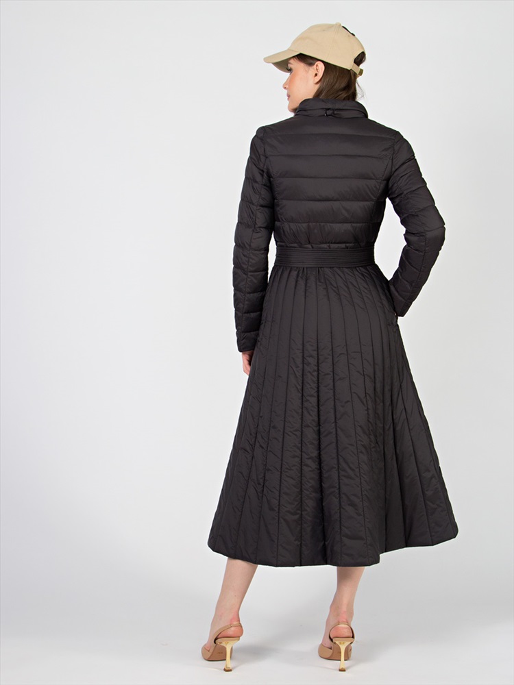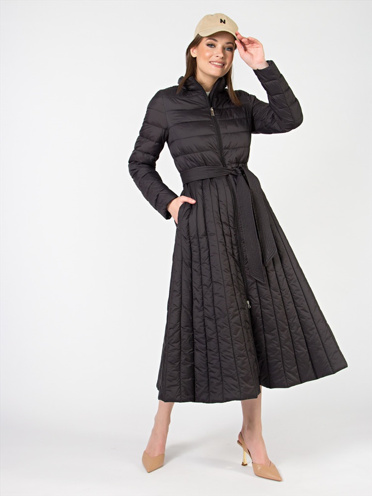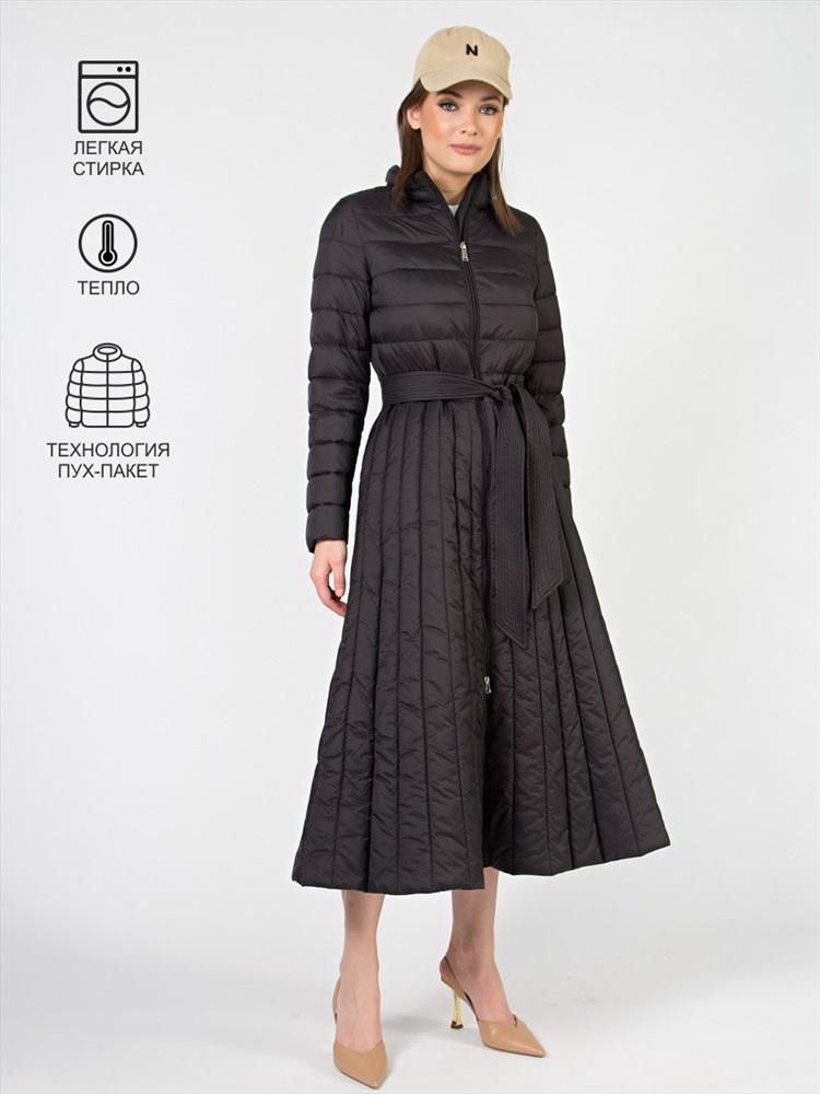 Длина: 124 см Стеганое женское пальто А-силуэта. Элегантная модель в классических цветах, длина-миди. Капюшон деликатно складывается в воротник. Центральная застежка на двухстороннюю молнию, удобно регулировать шаг. Отрезная талия подчеркивается поясом. Пропорции длины и объема идеальны, поэтому пальто подходит на рост от 155 см.