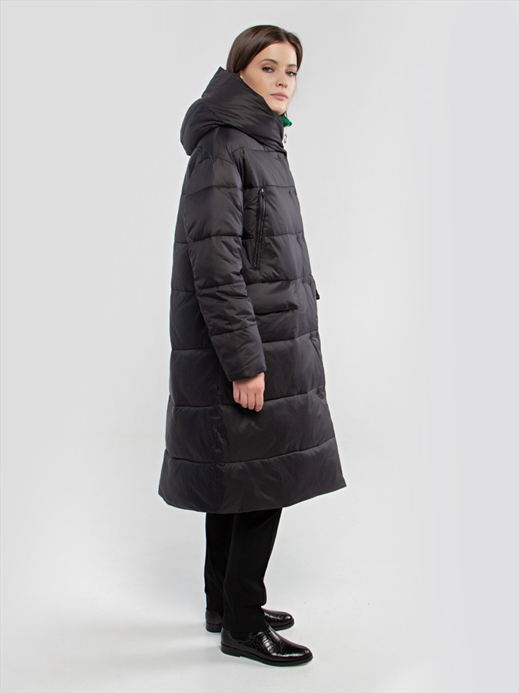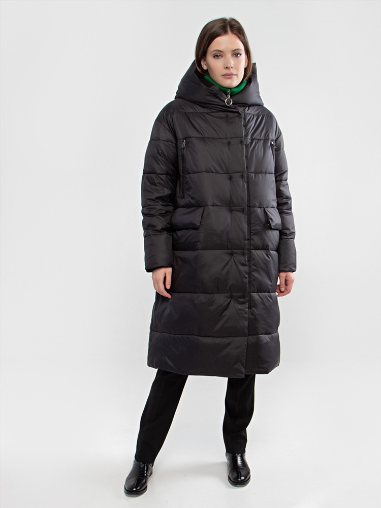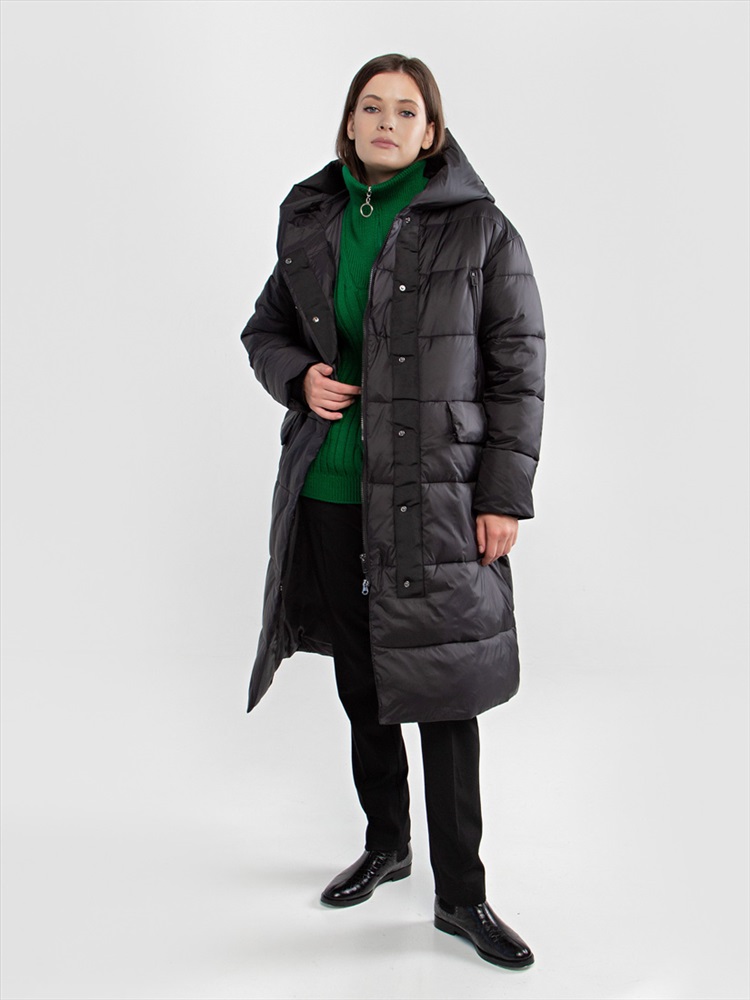 Длина: 108см Пуховик средней длины из осенне-зимней коллекции станет идеальным вариантом верхней одежды для холодной ветреной погоды. Стеганое пальто сшили из тонкого плотного непродуваемого нейлона с гладкой  поверхностью. Изделие утеплили легким  био-пухом из переработанного пластика. За дополнительный комфорт отвечают объемный цельнокроеный капюшон, широкая планка и теплые карманы. Пуховик декорирован фактурными лентами в тон ткани верха, которые дополнительно усиливают кнопки.