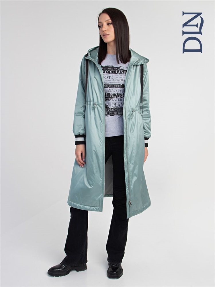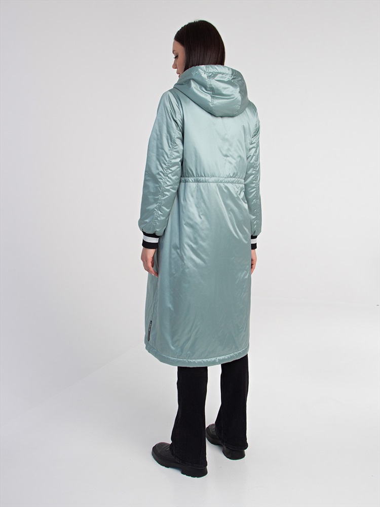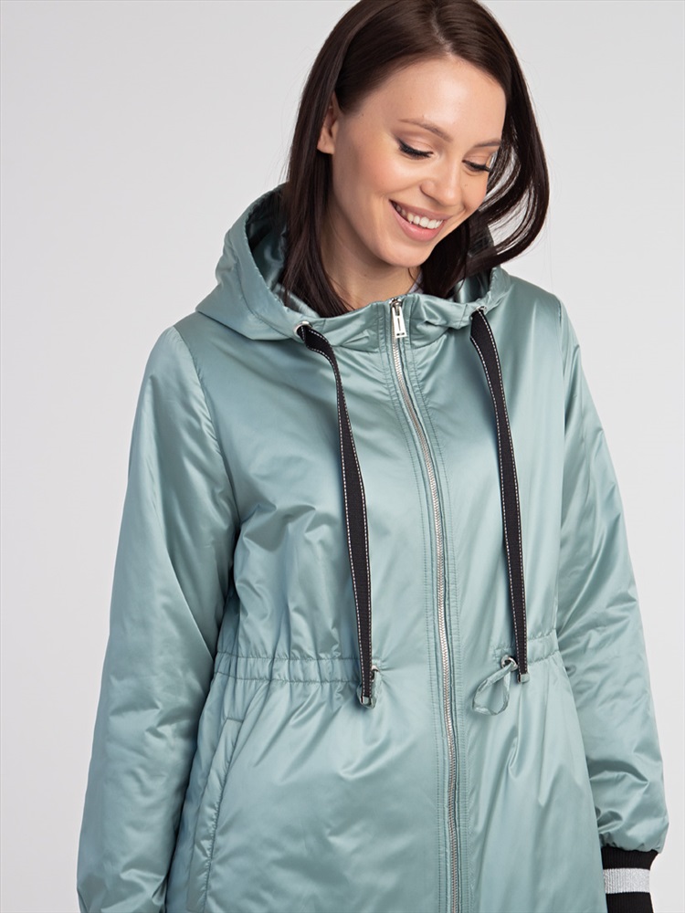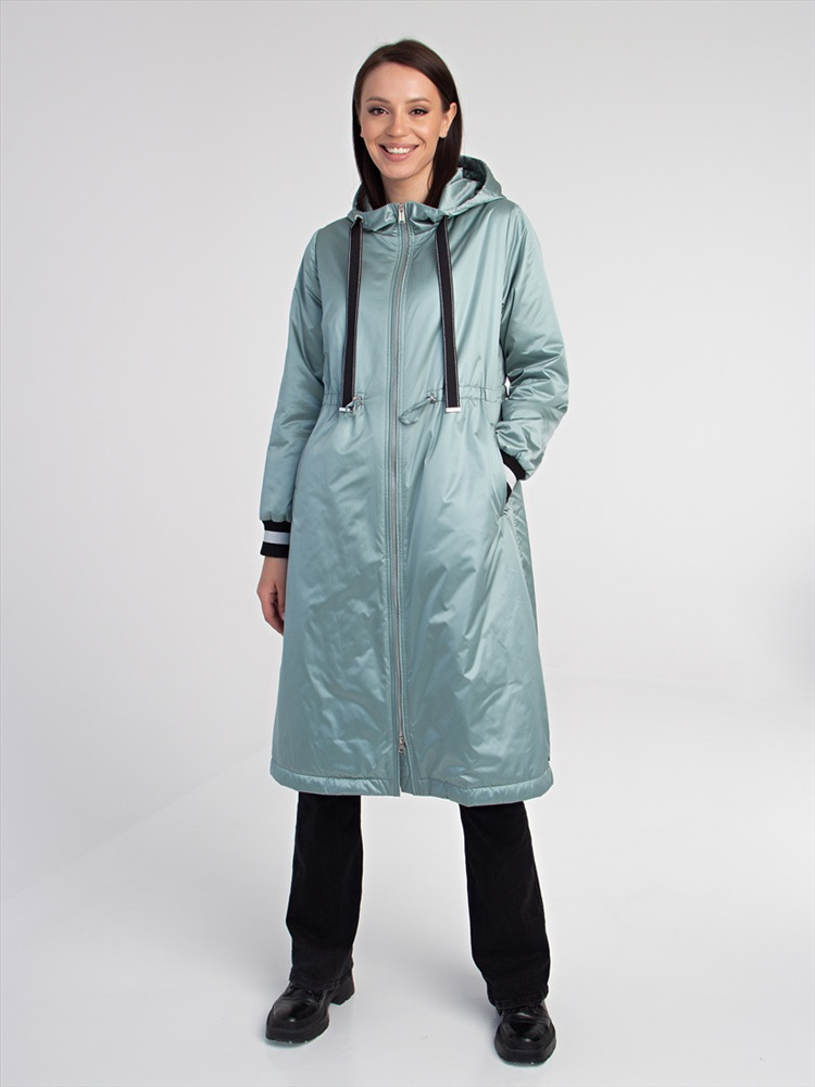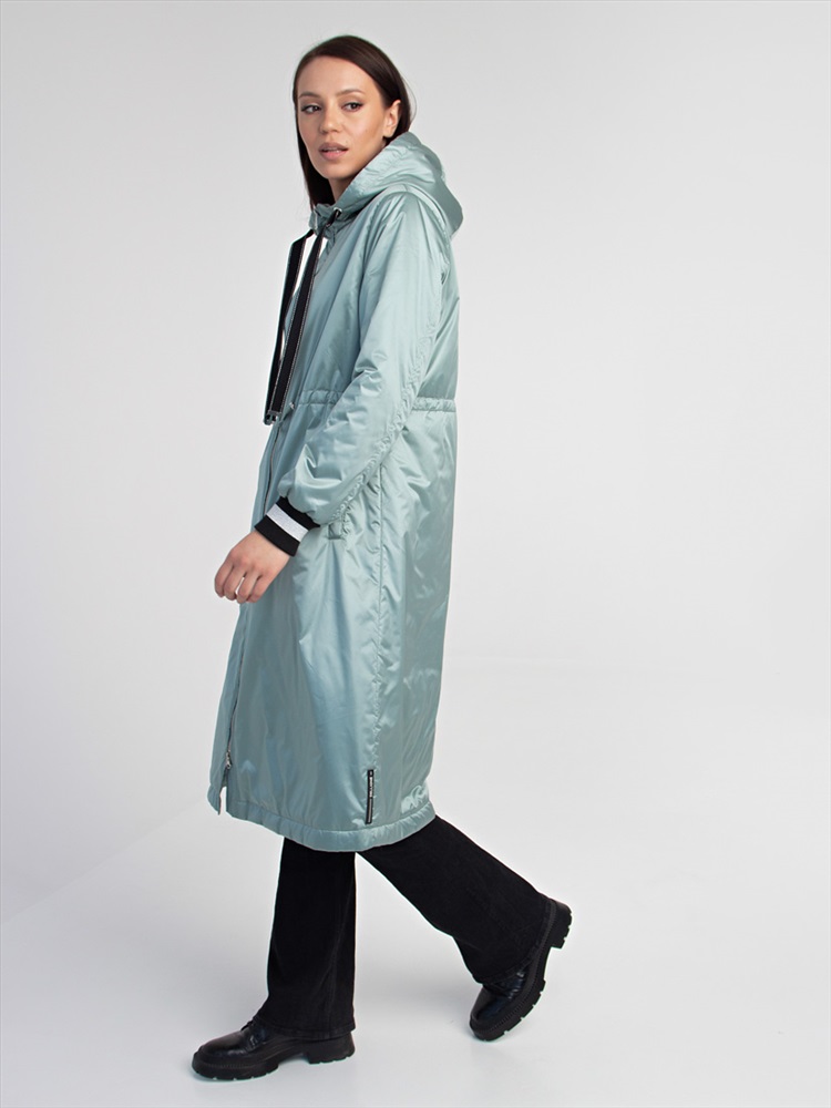 Длина: 112 см Универсальное пальто на тонком утеплителе с трикатажными манжетами, карманы прорезные. Цельнокройный капюшон с лентами,  кулиска по линии талии. Центральная застежка на металлическую молнию. Рост модели 172 см, на ней пальто размера 42.