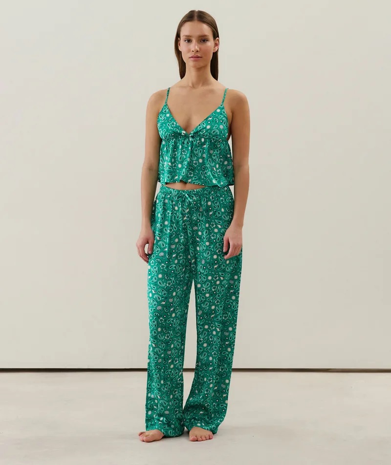 Descubre el pantalón de satén MINISATINIZ, ¡un modelo ancho con un hermoso volumen! Su cintura elástica es ajustable gracias a un cordón para atar. Nos encanta su estampado inspirado en el pañuelo bandana, un verdadero flechazo. Disponible en talla +. Para un look completo, combínalo con el top a juego. Además: forma parte de nuestra gama We care.