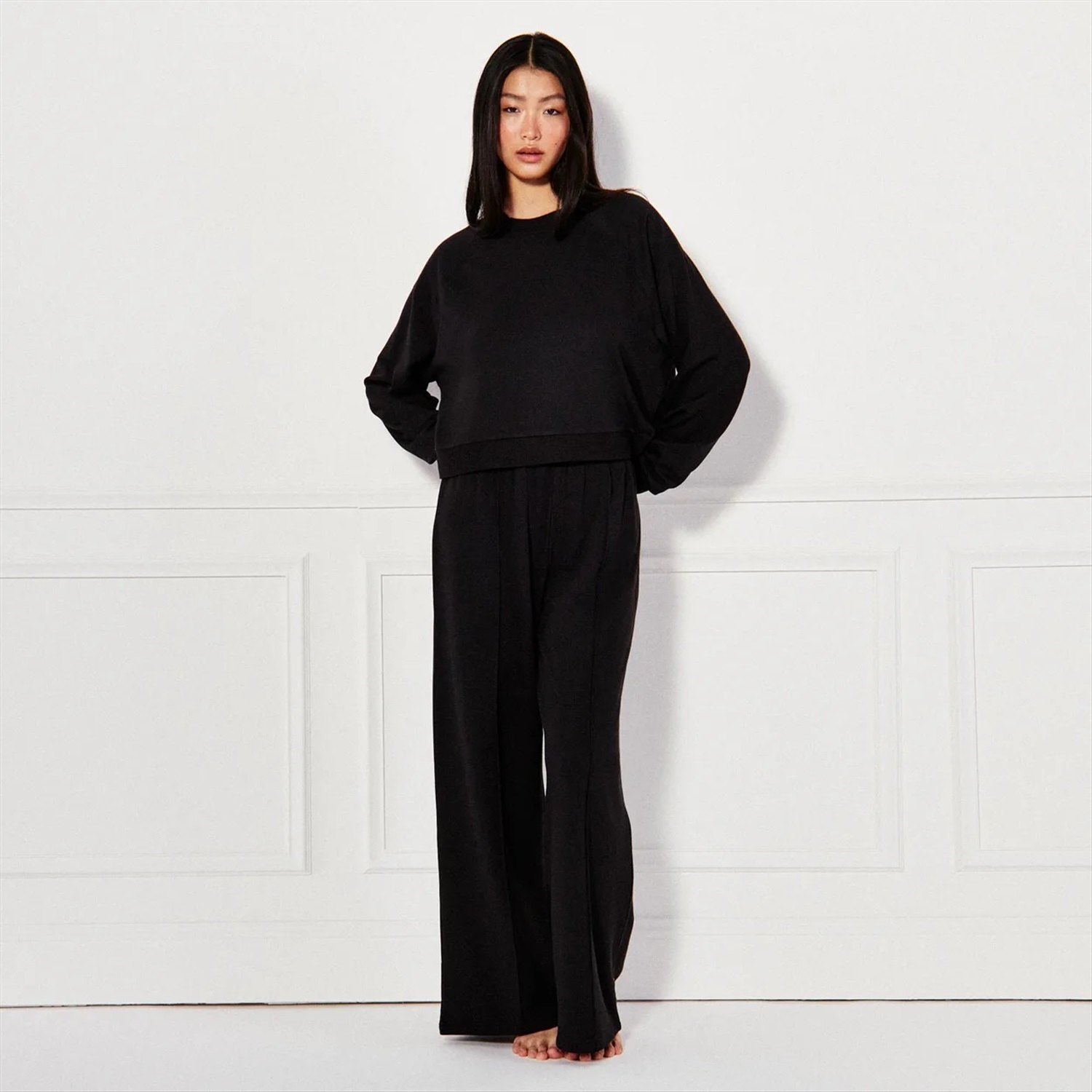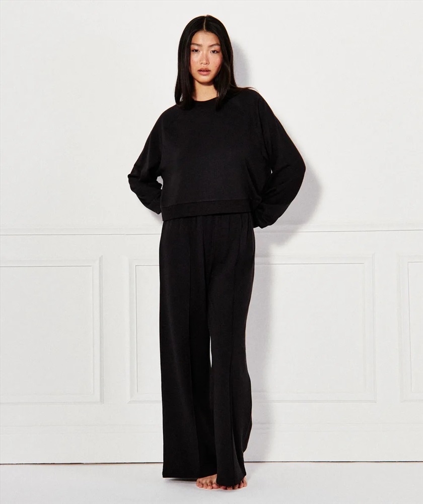 Descubre el pantalón SOFTIZ en suave muletón para estar supercómoda. Este pantalón de chándal de pernera recta, con cintura elástica y costura a media pierna, es ideal para relajarse sin perder el estilo. Lúcelo con la sudadera SOFTIZ para un look completo.\n- Pantalón SOFTIZ \n- Color: negro \n- Muletón \n- Se puede combinar con la sudadera SOFTIZ