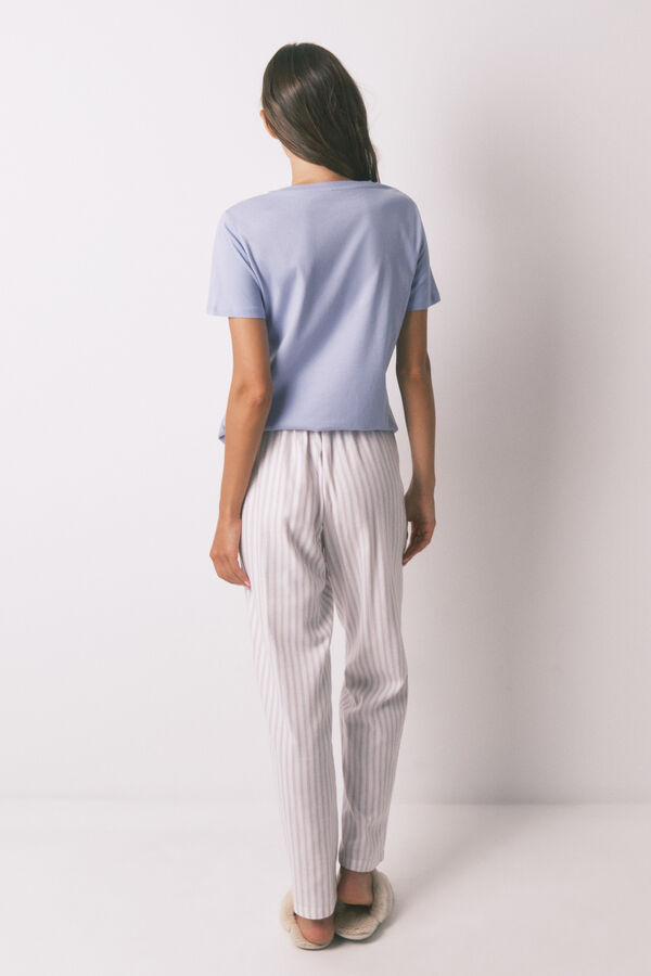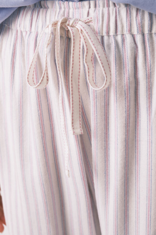 Pantalón largo ancho en tejido franela de algodón y viscosa, con estampado allover de rayas. Con cinturilla elástica regulable mediante cordón. Ideal para looks cómodos y relajados.