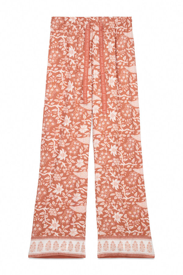 Pantalón largo en tejido de viscosa, con estampado allover floral. Cinturilla elástica regulable mediante cordón con texto estampado. Bajo con detalle de cenefa. Ideal para looks cómodos y relajados.