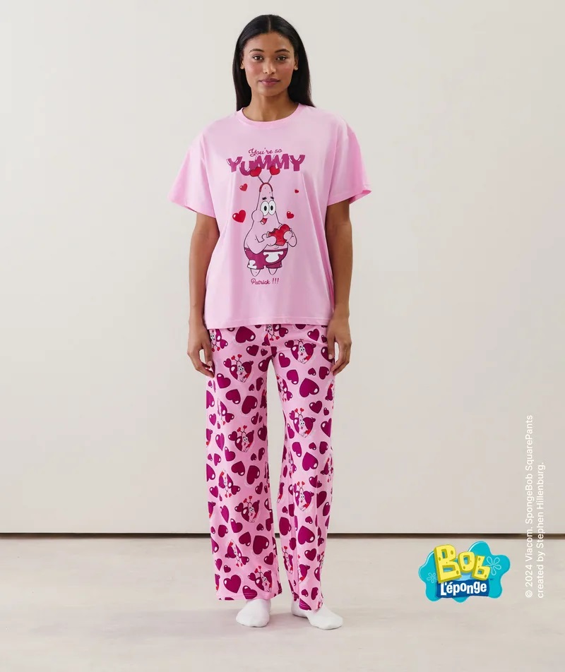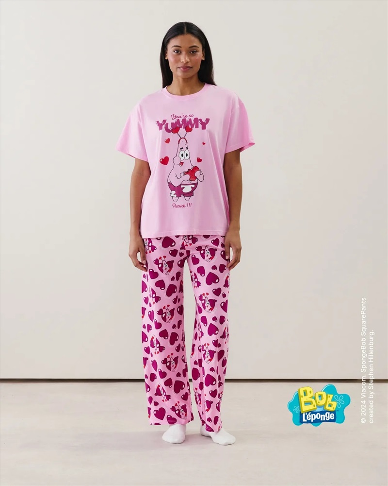 Enamorate de estos pantalones de jersey, ideales para San Valentin. Presentan un estampado de corazones y tu personaje favorito, Patrick, en toda la superficie, para un toque divertido yoriginal. Su corte de pierna recta, con cordon en la cintura para ajustar tu pijama a tu gusto, lo convierte en un básico imprescindible en tu armario. Además: nuestros pantalones están disponibles en tallas + para las más altas (5 cm más de largo de pierna). ¡Forma parte de nuestra gama We Care!