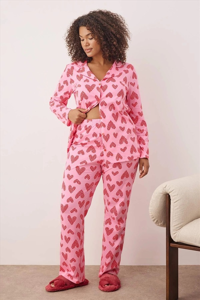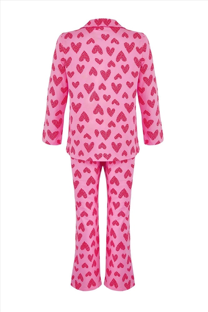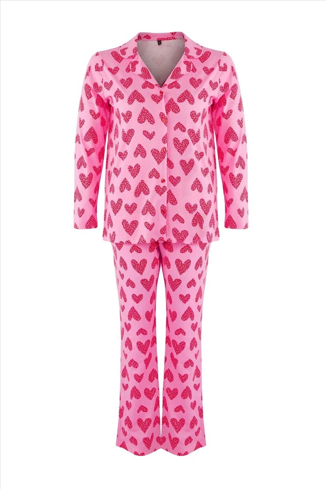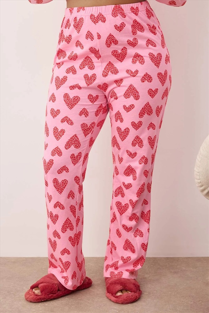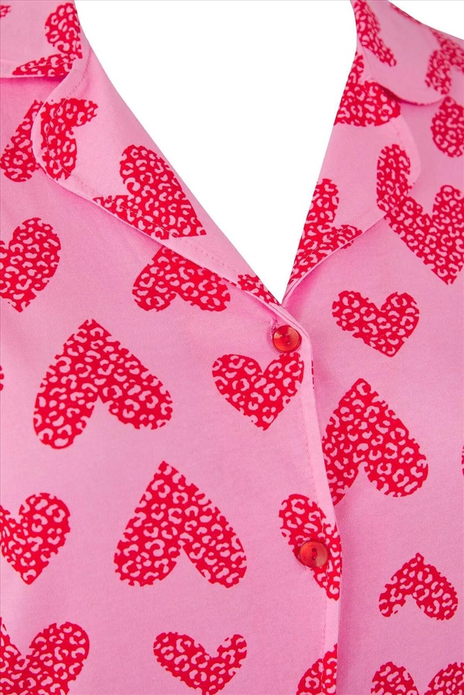 Pembe %100 Pamuklu Kalp & Leopar Desenli Gömlek-Pantolon Örme Pijama Takımı TBBAW26AI00017