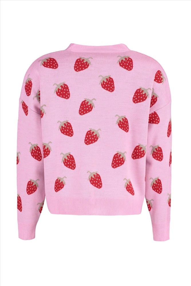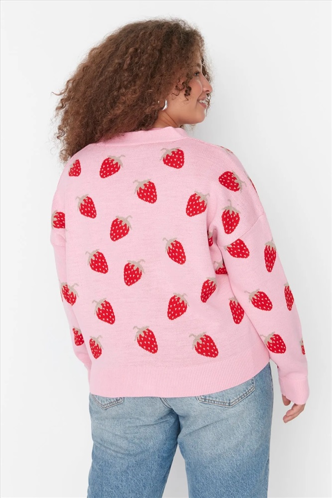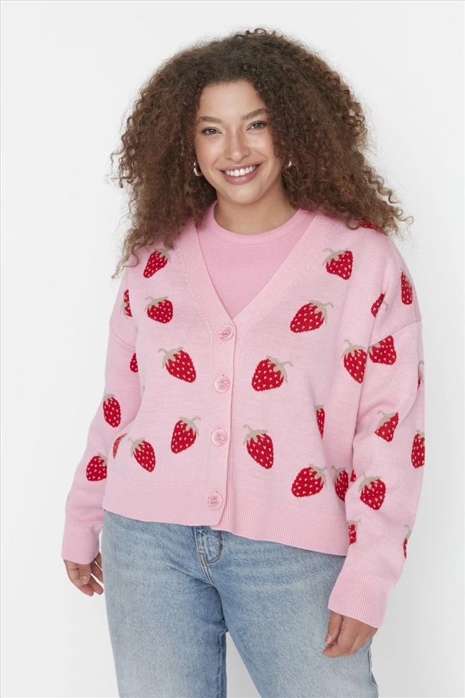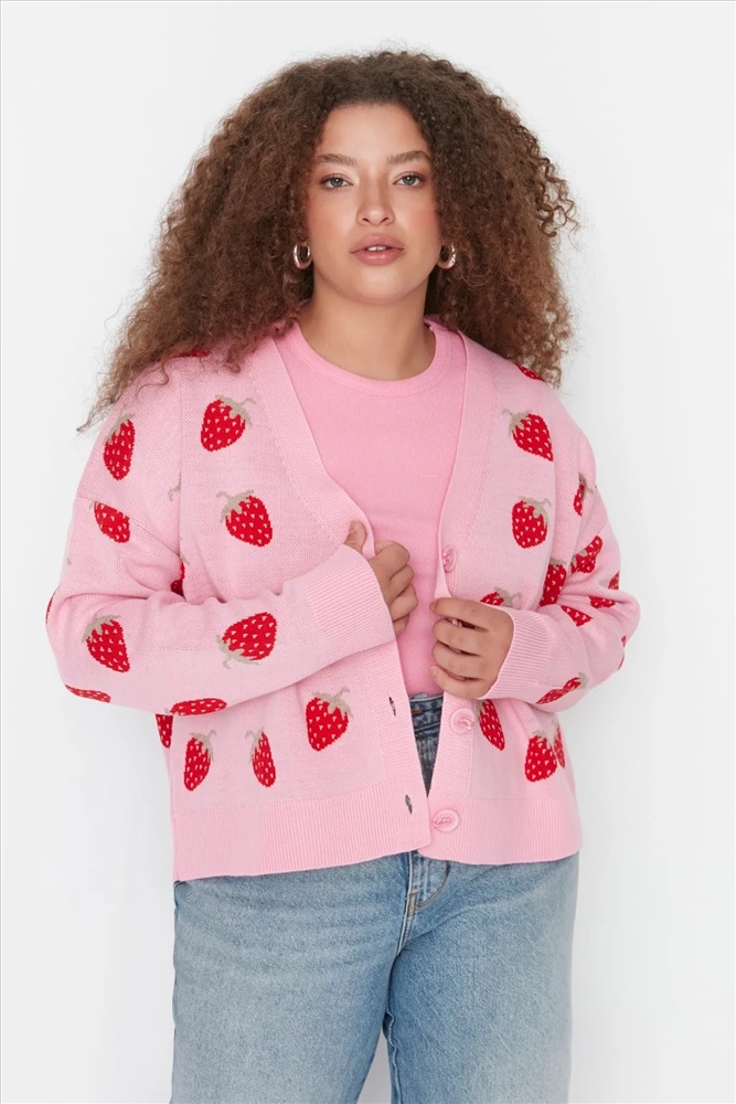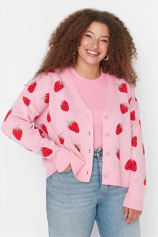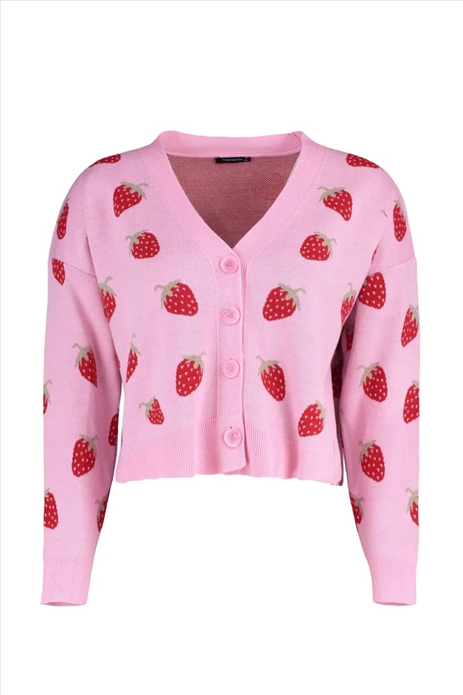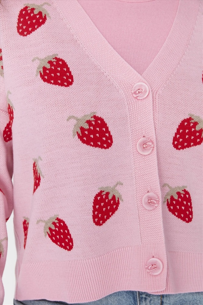 Pembe Çilek Desenli V Yaka Crop Triko Hırka TBBAW23AV00028