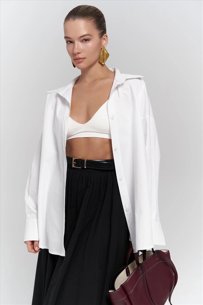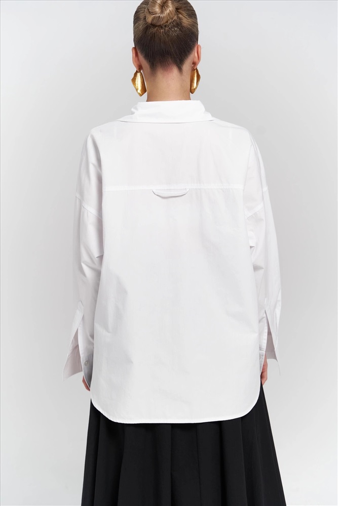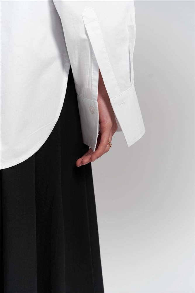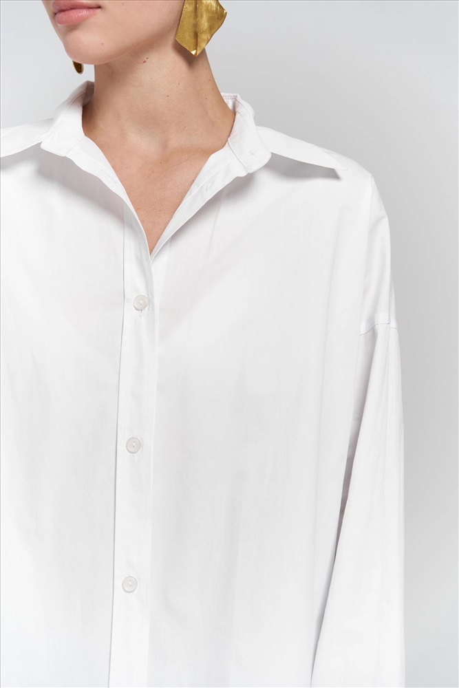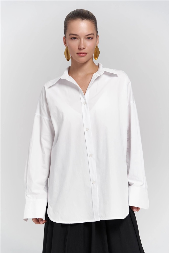 Рубашка с широким воротником, длинными рукавами и пуговицами спереди.