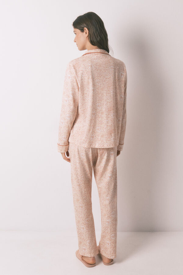 Pijama camisero de manga y pantalón largo con estampado allover de flores en tejido de algodón. Top con cuello camisero y botones a contraste, bolsillo posicionado en el pecho con detalles de vivos a contraste en los puños. Pantalón con cinturilla elástica ajustable mediante cinta a tono. Ideal para dormir o estar en casa muy cómoda.