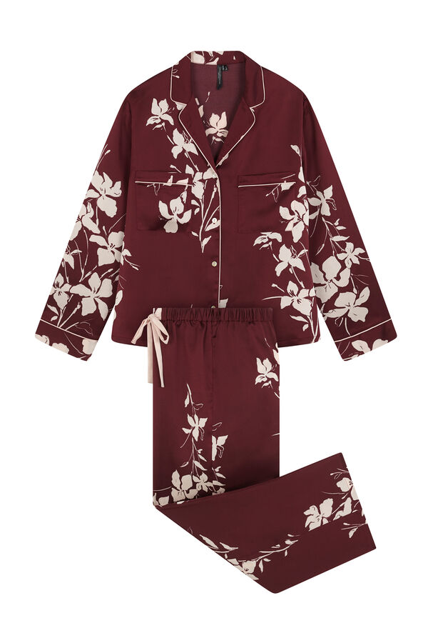 Pijama largo camisero con estampado floral en satén. Top con solapas y botones en contraste, bolsillos frontales y vivos decorativos. Pantalón con cintura ajustable y cordón a contraste. Ligero, ideal para climas cálidos.