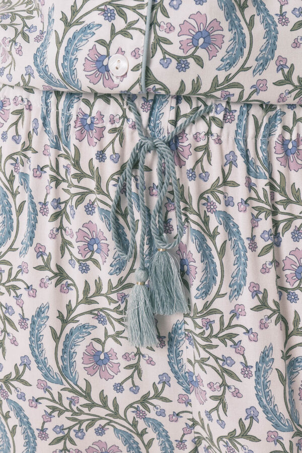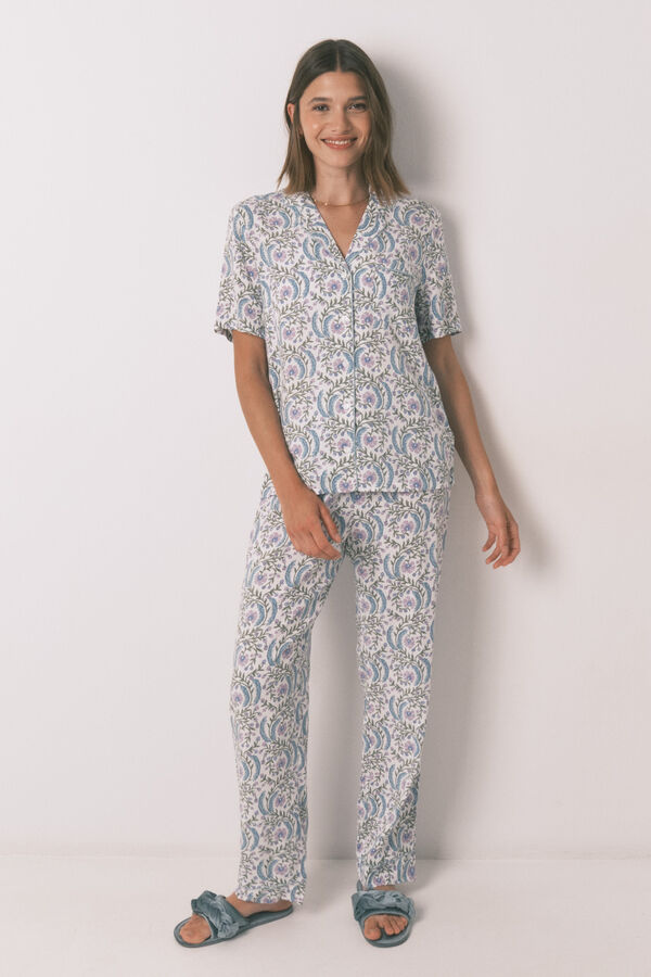Pijama camisero de manga corta y pantalón largo con estampado allover de flores en tejido de viscosa ECOVERO™. Top con cuello camisero y botones a tono con detalles de vivos a tono a conjunto con los bajos de manga. Pantalón con cinturilla elástica ajustable mediante cinta a tono y cenefa en bajo. Ideal para dormir o estar en casa muy cómoda.