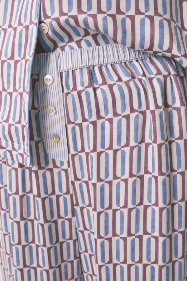 Pijama camisero de manga y pantalón largo confeccionado en tejido satén de viscosa con estampado allover geométrico. Parte superior con cuello camisero, cierre de botones a tono, bolsillo de plastrón en pecho y detalles de vivos a contraste, a conjunto con los de los puños de la manga. Pantalón con cinturilla elástica y tejido que sobresale a conjunto con la falsa bragueta, con tres botones decorativos a tono. Bajos con cenefa del mismo estampado y vivos a contraste.