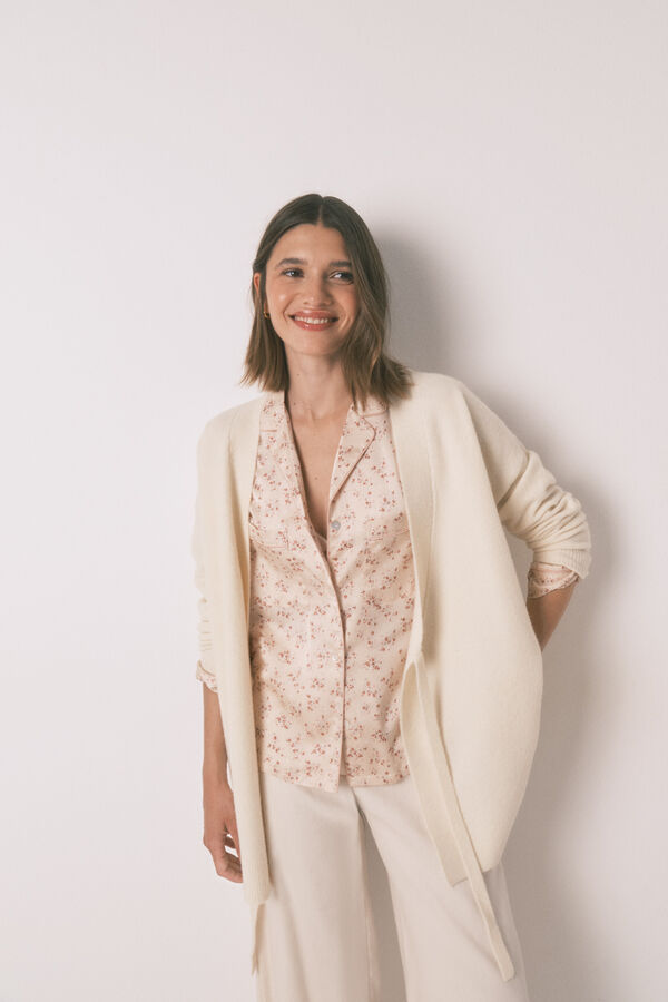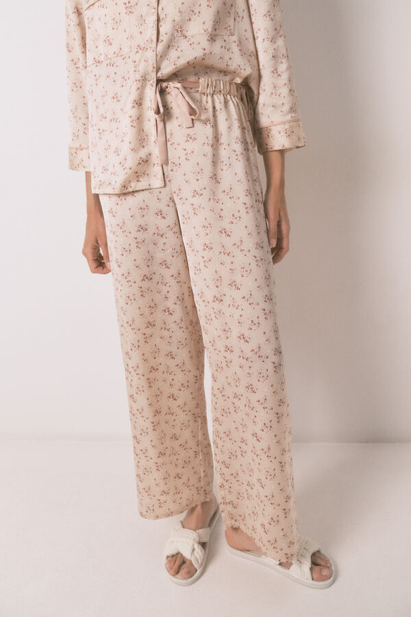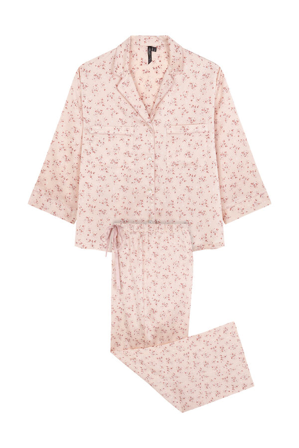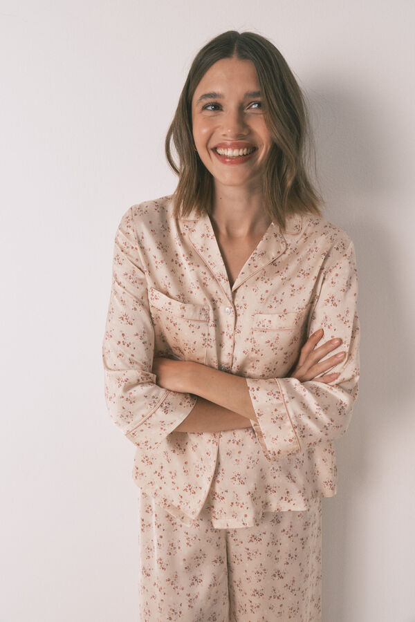 Pijama camisero de manga 3/4 y pantalón largo, con estampado allover de flores en tejido satén mate. Ideal para dormir o estar en casa cómoda y con estilo. ¡Tú eliges!
