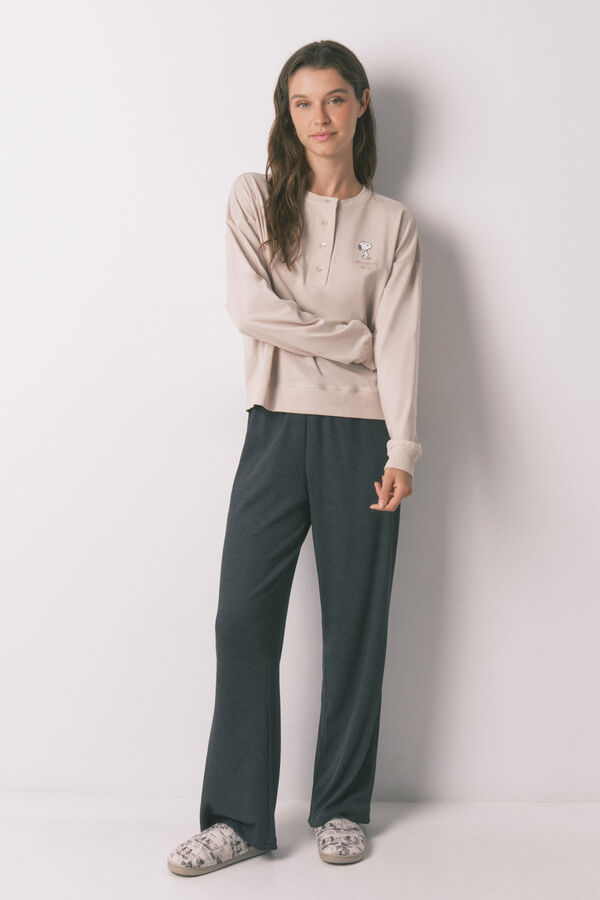 Pijama largo confeccionado en tejido 100% algodón, con multi estampado de motivos de Snoopy ¡Perfecto para esas noches más fresquitas y para estar en casa súper calentita y con estilo!