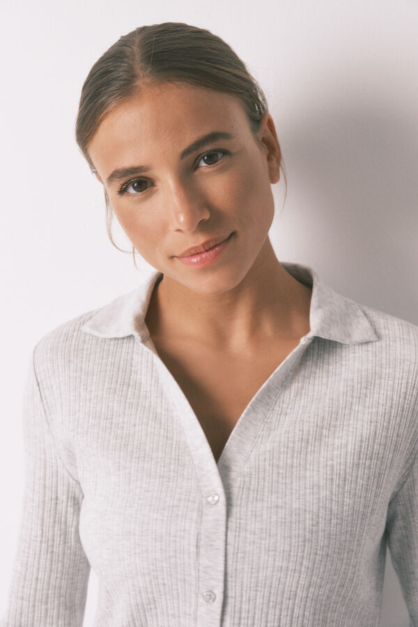Conjunto de lifewear de manga y pantalón largo liso en tejido canalé de algodón y viscosa. Top con cuello camisero y abertura en pico que se une como tapeta central abrochada con botones a tono. Pantalón lounge fluido con cinturilla elástica regulable mediante cordón a tono. Ideal para dormir o estar en casa muy cómoda.