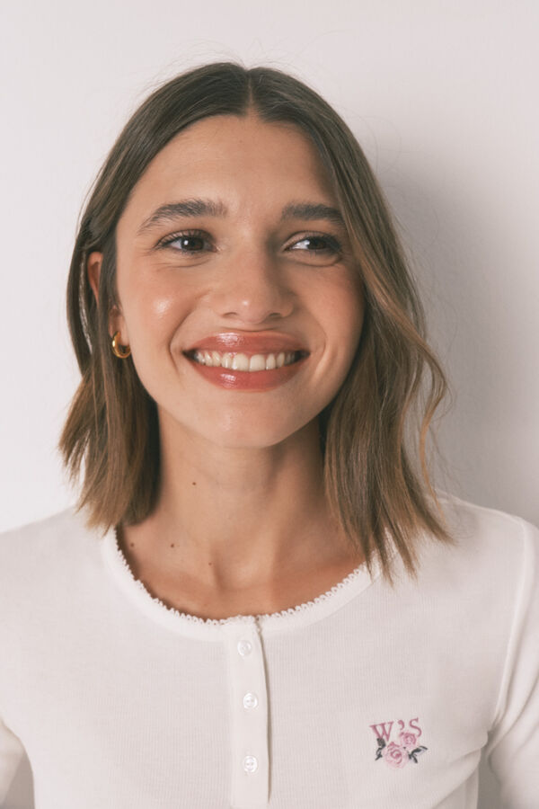 - Top liso con escote redondo y puntilla decorativa, abotonadura con tapeta central con botones a tono y pequeño bordado floral en el pecho.