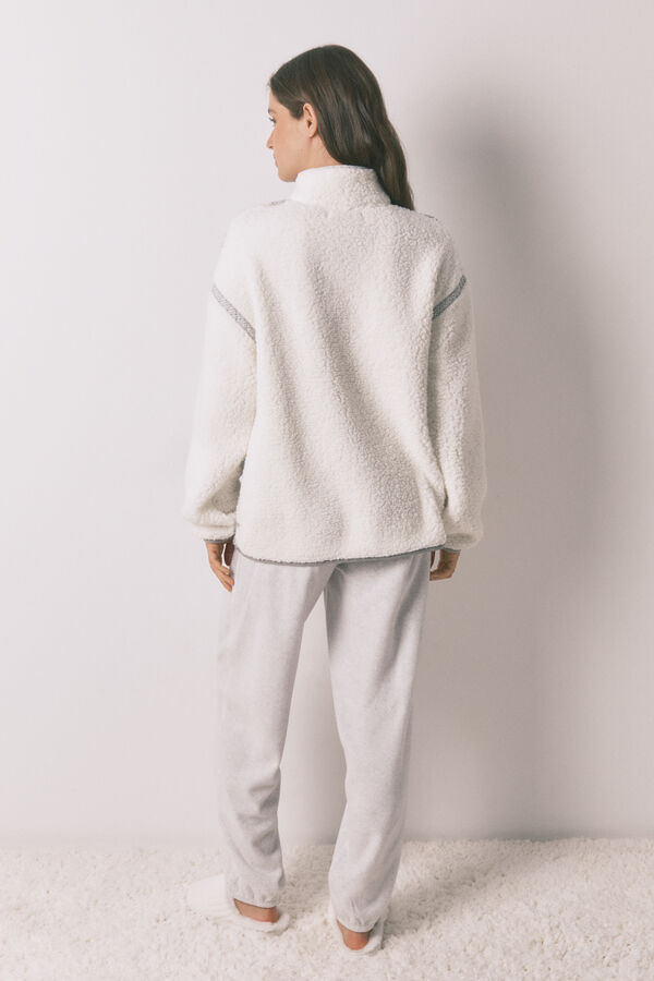 Pijama de manga larga de tejido borreguito y pantalón de polar suave. Ideal para estar en casa o dormir súper calentita.