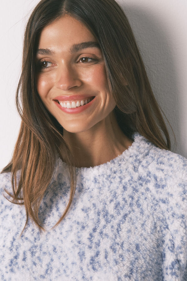 Pijama manga y pantalón largo confeccionado en acabado de borreguito súper calentito, perfecto para dormir o estar en casa sin pasar nada de frío.