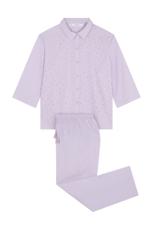 -Parte de arriba de manga ¾ con strass a tono en parte superior frontal, con cuello camisero y abrochado frontal mediante tapeta con botones a tono. -Pantalón largo con cinturilla elástica regulable mediante cordón a tono. - Llévalo a juego con las zapatillas de la colección.
