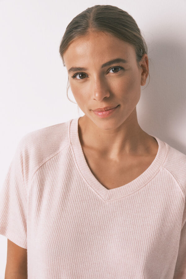 Conjunto de lifewear de manga corta y pantalón largo fluido liso en tejido de canalé perchado. Top con escote en pico pulido con vivo del mismo género, manga raglán y con bajo fruncido para abullonar ligeramente el top. Pantalón lounge con cinturilla elástica regulable mediante cordón a tono. Ideal para dormir o estar en casa muy cómoda.