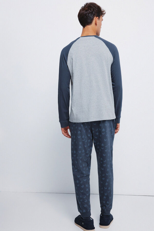 Pijama largo de punto de algodón en tonos gris y azul. Camiseta de algodón con manga ranglan con bordado de Minions en el pecho. Pantalón con print de plátanos con bolsillos y cinturilla elástica ajustable con cordón y puños en el bajo.