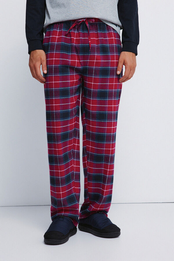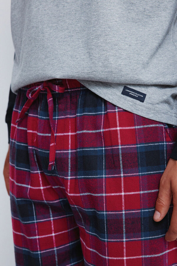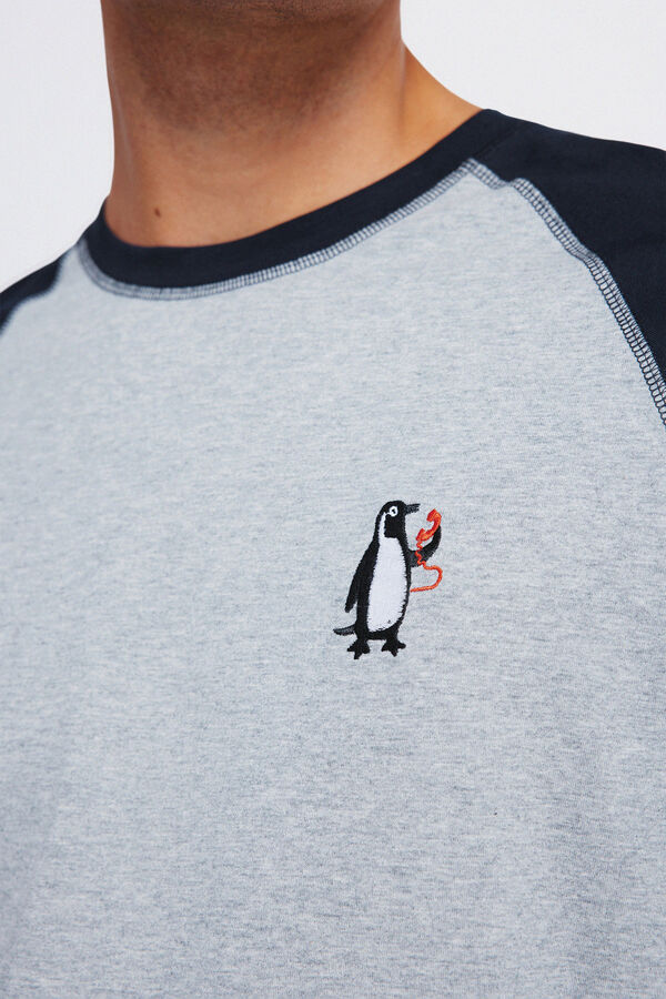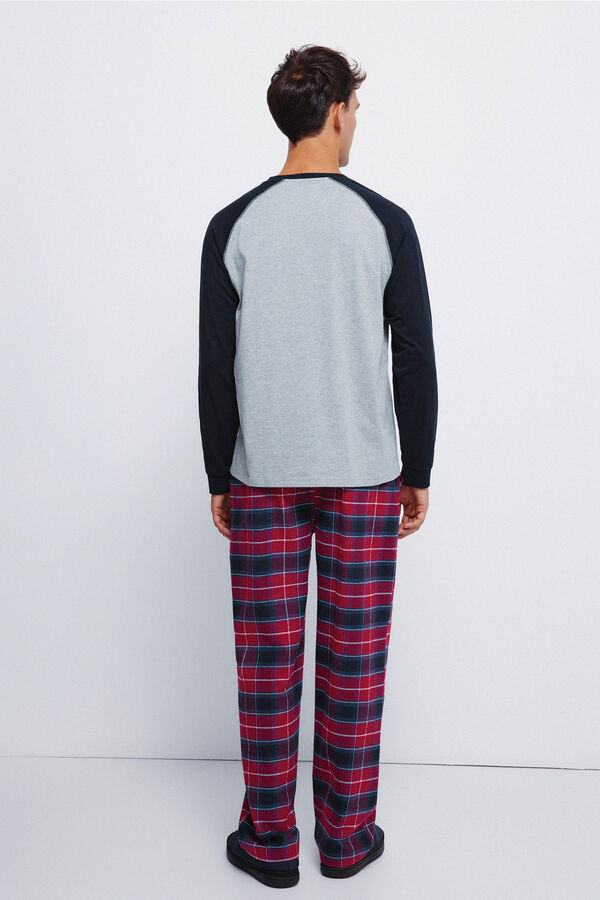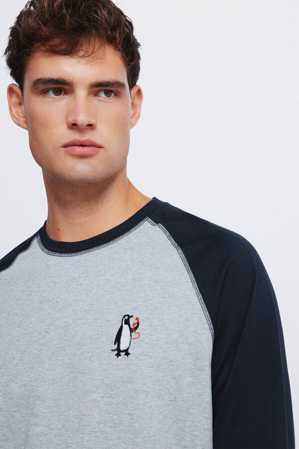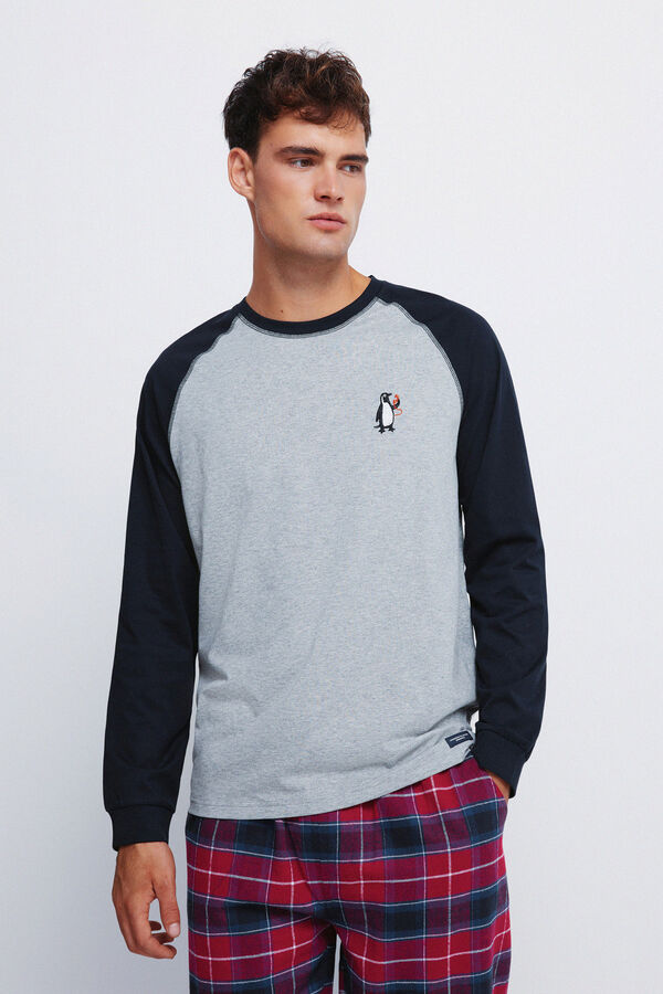 Pijama largo de algodón con manga ranglan en tonos gris, azul y rojo. Camiseta gris y azul con bordado en el pecho de pingüino. Pantalón de cuadros de colores azul y rojo con bolsillos y cordón ajustable.