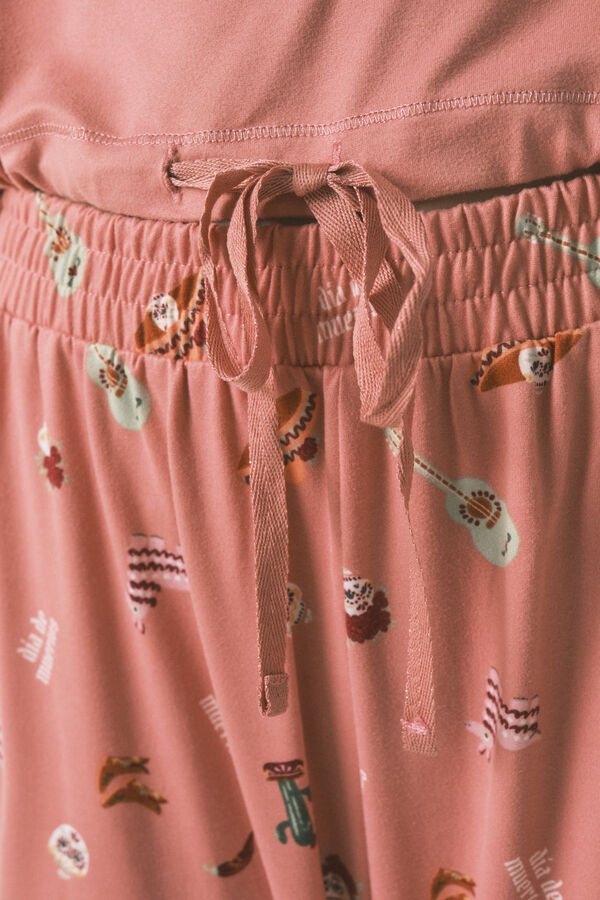 Pijama largo en tejido polar súper suave, con divertidos estampados con motivo del "Día de los muertos". Top de manga larga liso con escote redondo, hombro caído, y cinturilla ajustable mediante cinta a tono. Pantalón largo con estampado allover y cinturilla elástica interior. Ideal para dormir o estar en casa muy cómoda.