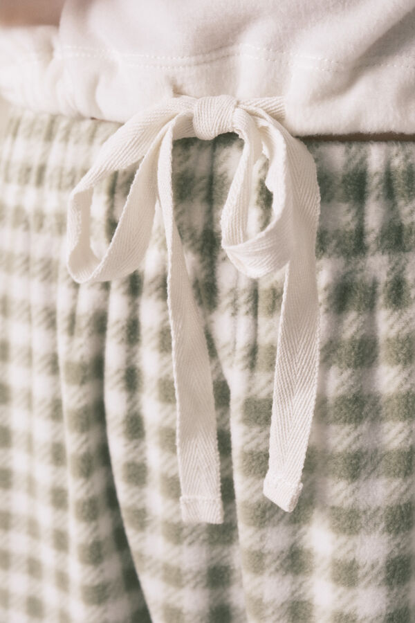 Pijama largo en tejido polar. Top liso con escote redondo, hombro caído, puños en mangas, bajo fruncido con cordón a tono y estampado posicional en centro delantero de Mafalda. Pantalón con estampado allover de cuadros, con cinturilla elástica interior y bajos ajustados con goma elástica.