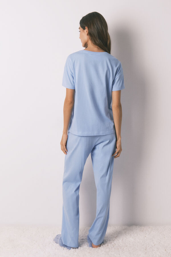 Pijama largo de manga corta, confeccionado en 100% algodón, perfecto para dormir y estar en casa con estilo. Parte de arriba con divertido posicionado de SmileyWorld® en el centro. Pantalón largo tipo lounge, con cómoda cinturilla elástica ajustable con cordón a tono.