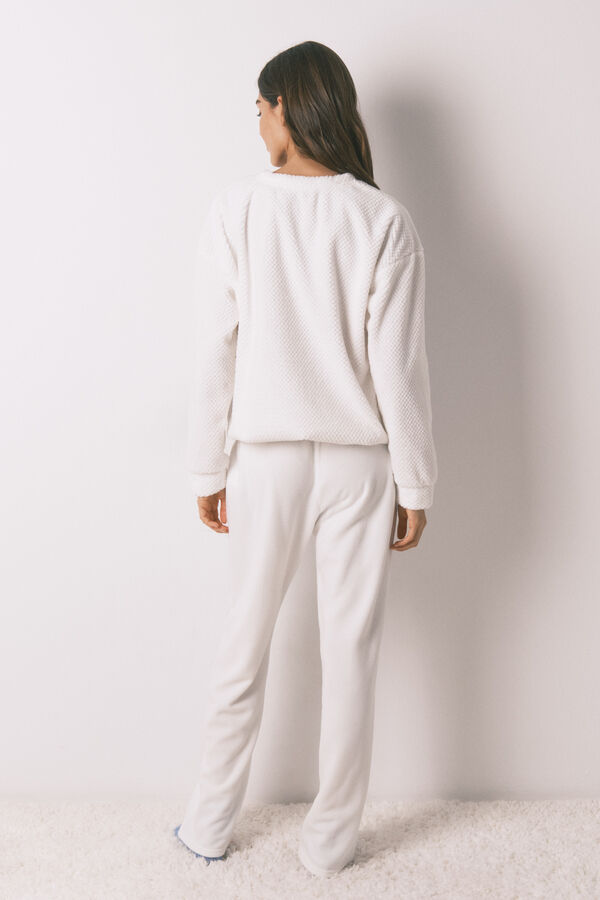 Pijama largo confeccionado en agradable acabado polar de pelo, súper calentito y gustoso al tacto. Parte de arriba con cuello redondo, divertido posicionado de Snoopy en el centro sobre detalle estampado de rombos, mangas caídas y bajo ajustable con cordón a tono. Pantalón tipo lounge con cinturilla elástica.
