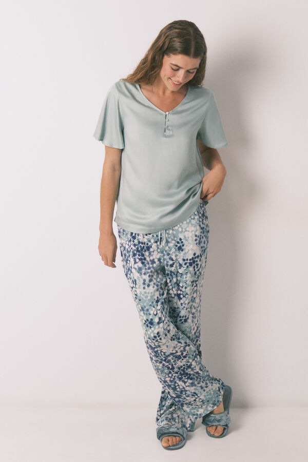 Pijama de manga corta y pantalón largo confeccionado en satén de viscosa. Top liso con escote en pico con abertura con botones a contraste, hombro caído, aberturas en bajos laterales y bajo más largo en espalda. Pantalón lounge con estampado de manchas allover y cinturilla elástica regulable mediante cordón a tono. Ideal para dormir o estar en casa cómoda y con estilo.
