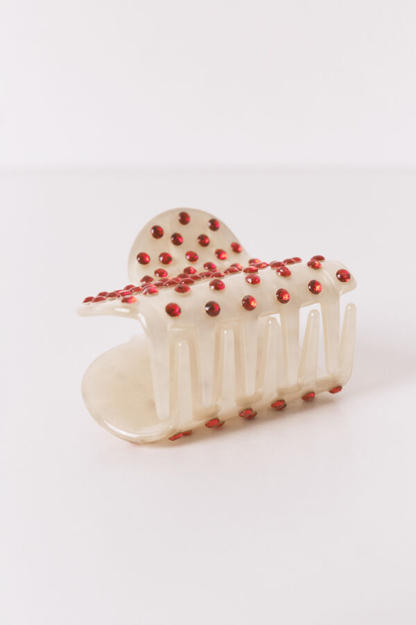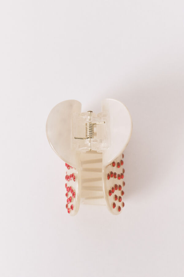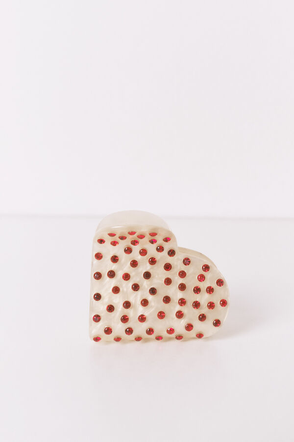 Pinza con forma de corazón en blanco, y con strasses en color rojo de brillos. Ideal para complementar tus looks diarios.
