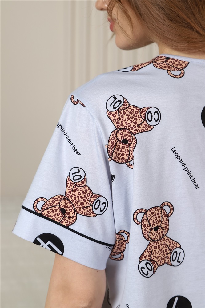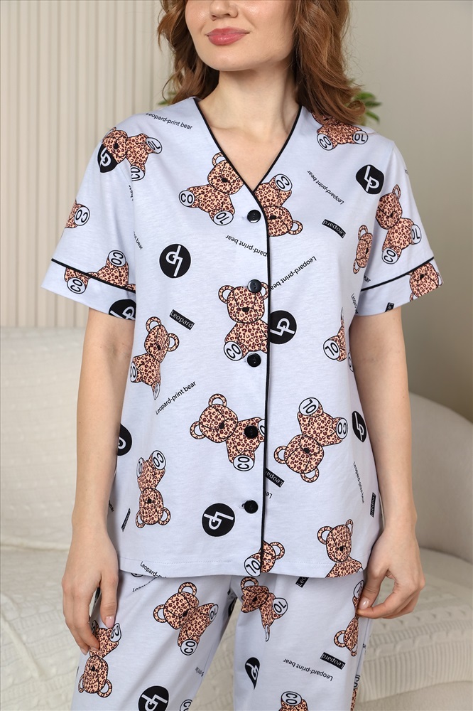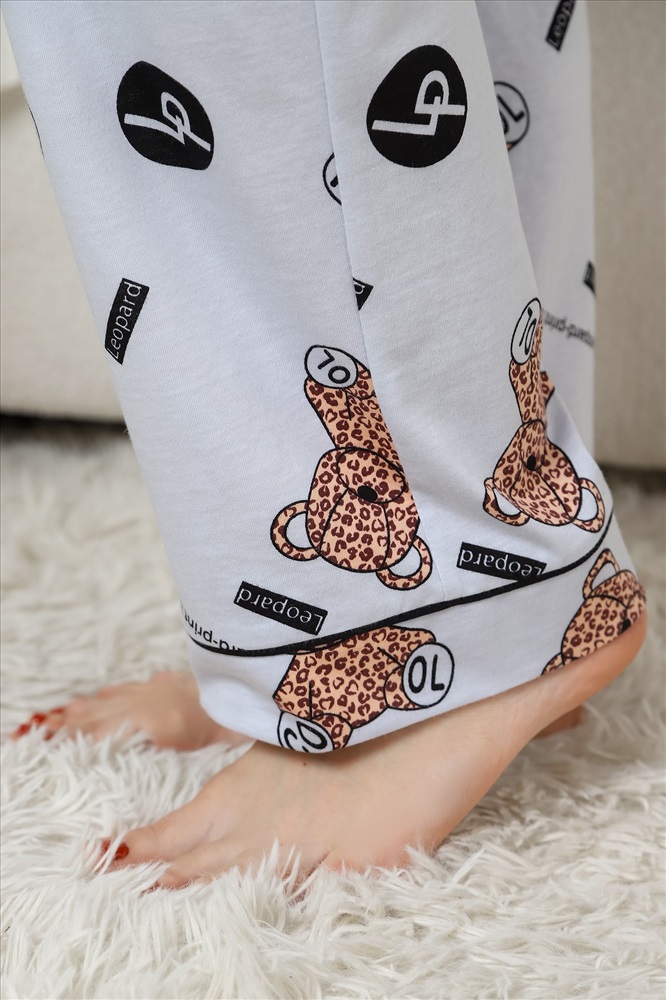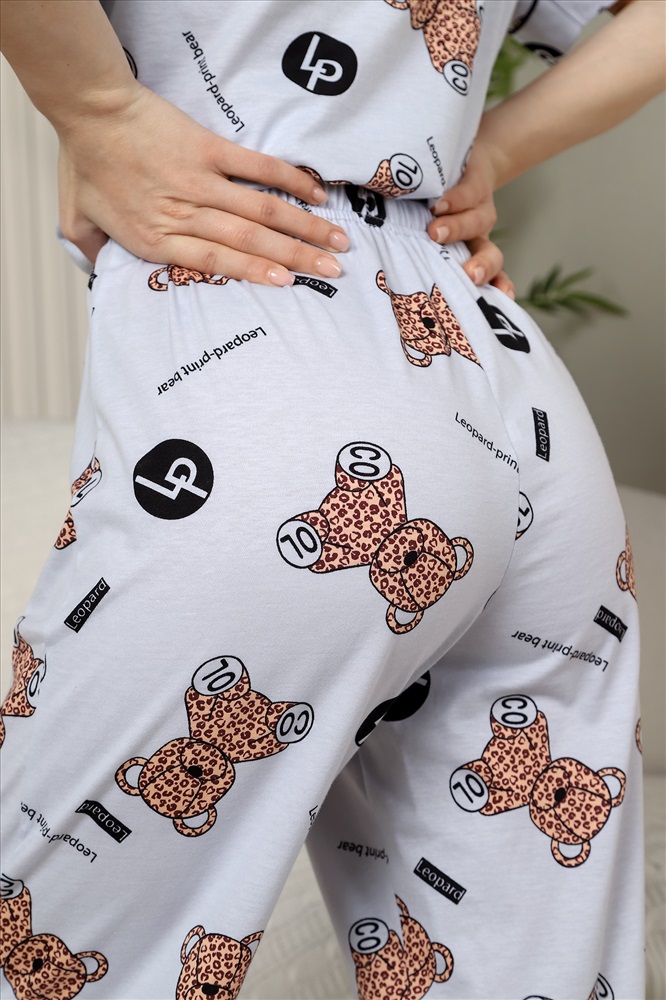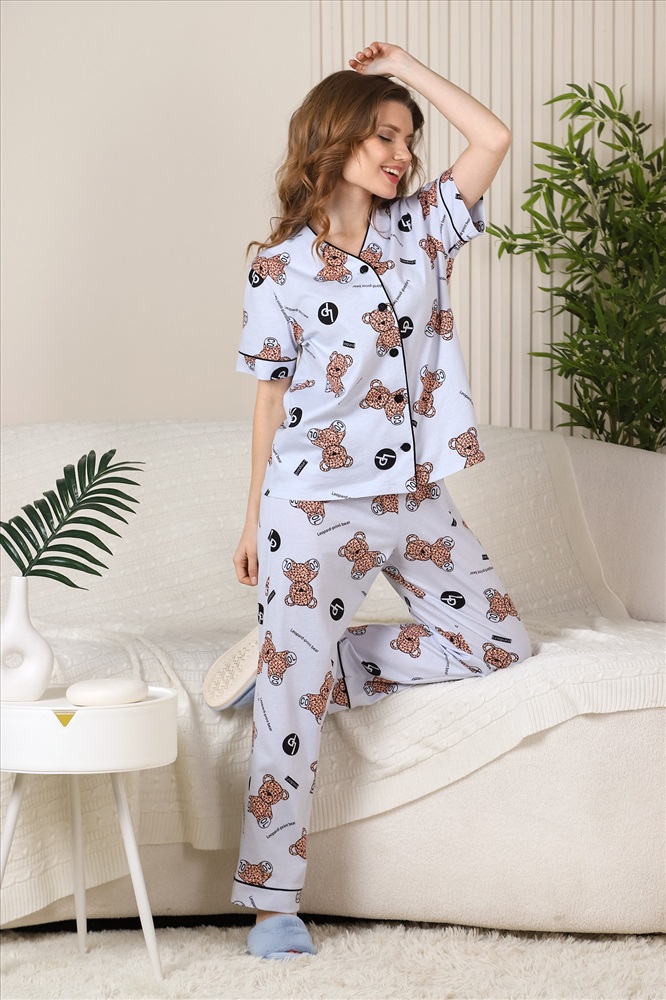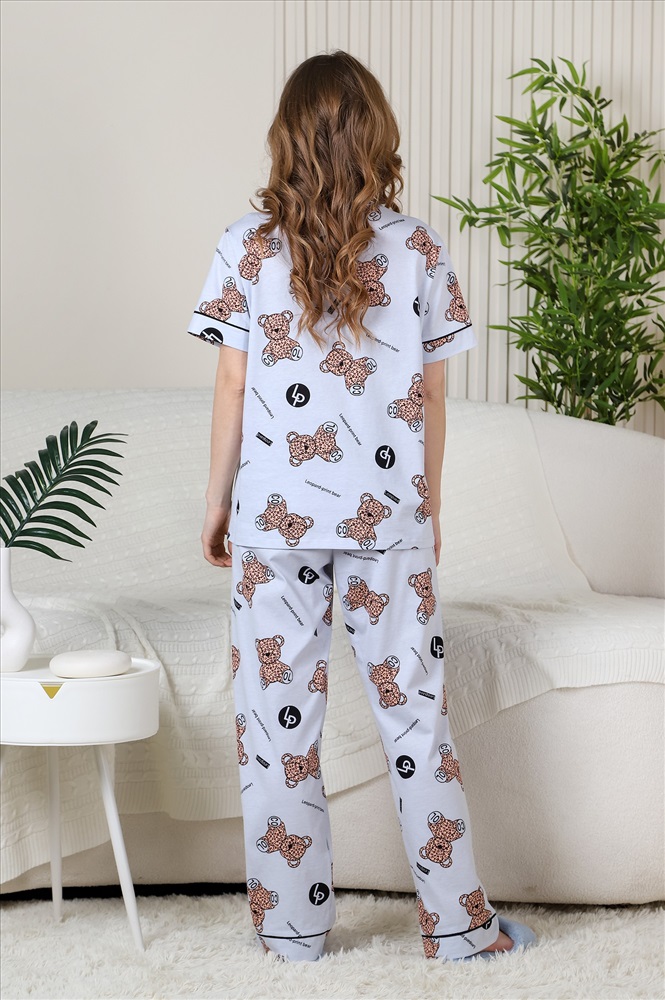 Ткань: Кулирка (пенье) Пижама молодежная из трикотажного полотна «кулирка» с набивным рисунком, состоящая из рубашки и брюк. Рубашка прямого силуэта, свободная, с короткими втачными рукавами, горловиной V- образной формы, переходящей в центральную бортовую застежку на обметанные петли и пуговицы. В шве обтачивания бортов, в соединительном шве притачивания манжет к нижним срезам рукавов, вставлен узкий кант контрастного цвета.Брюки длинные, свободные, с эластичной тесьмой по талии и притачными манжетами с узким кантом контрастного цвета в соединительных швах.