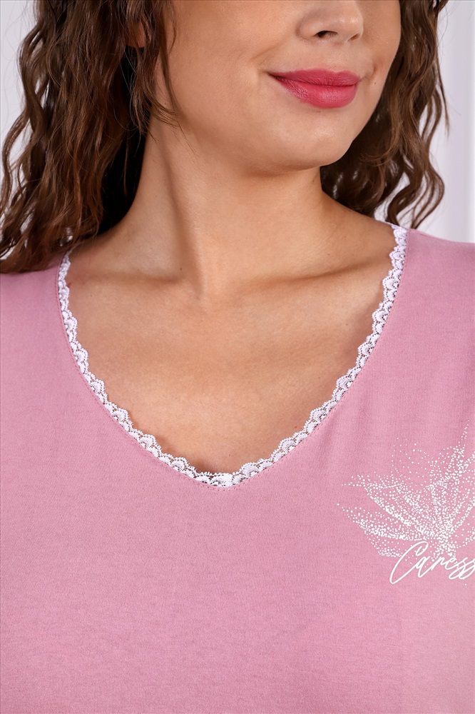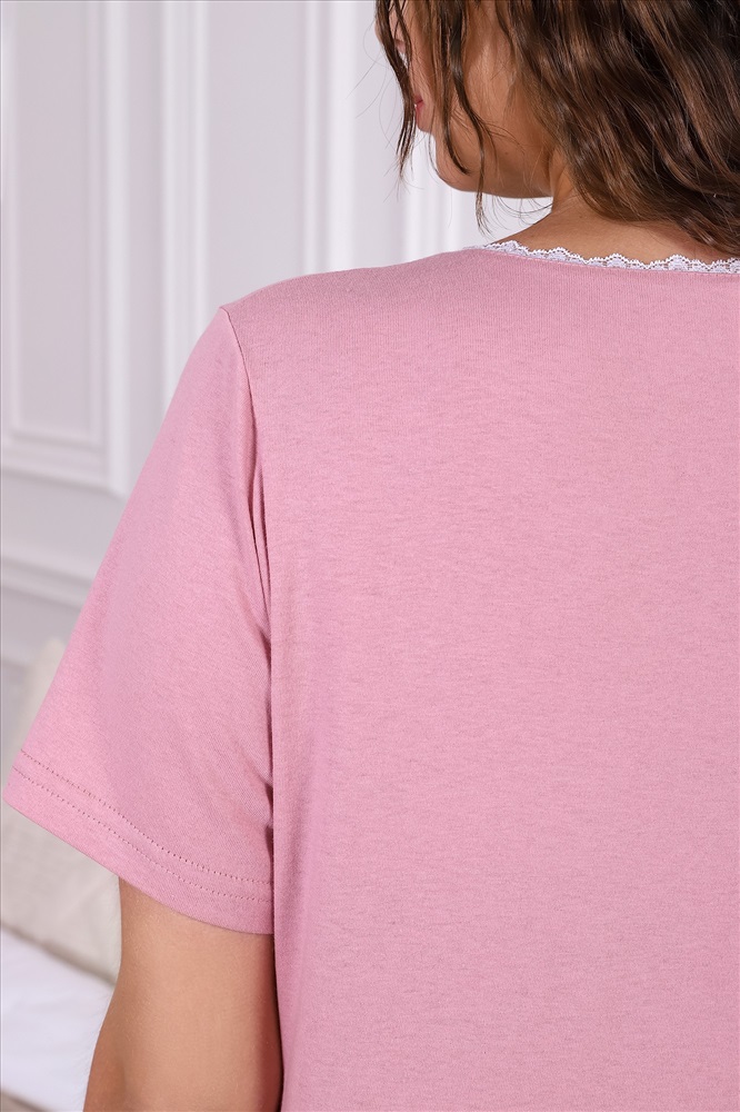 горловиной V-образной формы. Срезы горловины обработаны узким кружевом.Бриджи – из полотна с набивным рисунком, свободные классического покроя, с эластичной тесьмой по талии.
