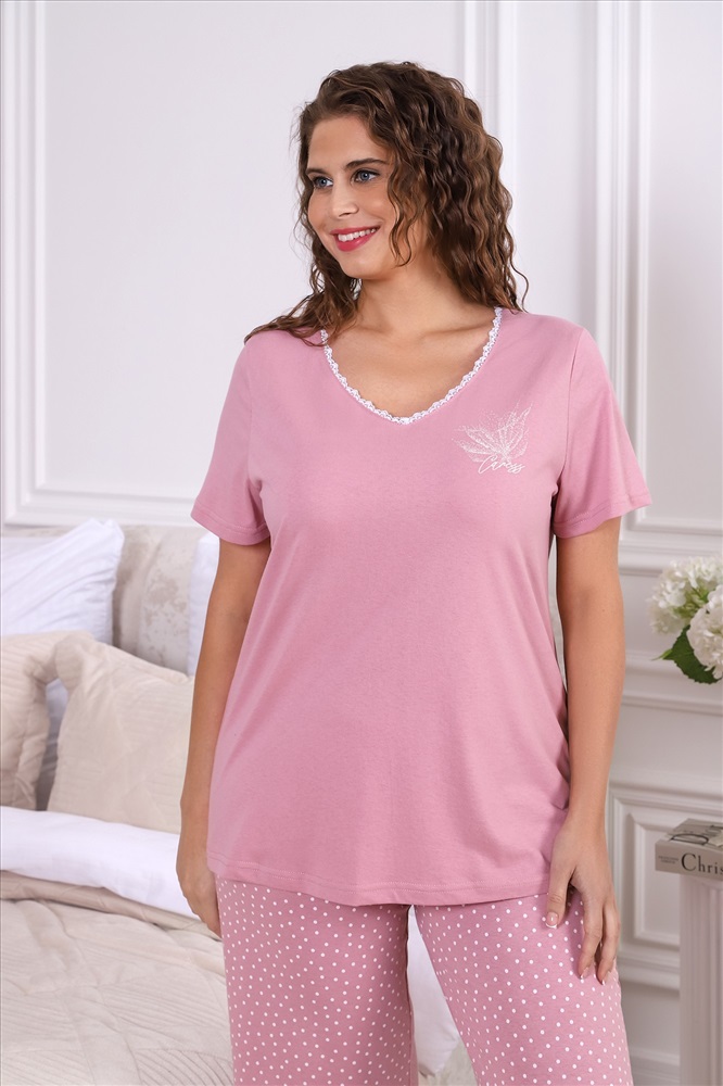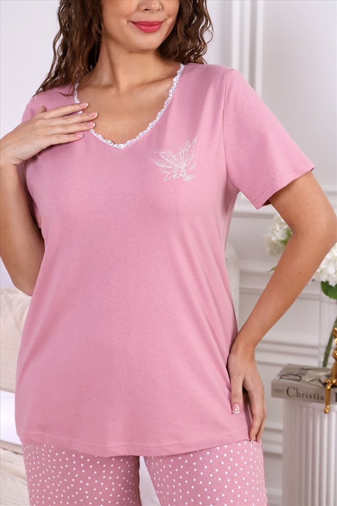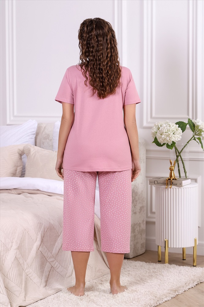 Ткань: Кулирка Кулирка - это самое гладкое и тонкое трикотажное полотно из чистого хлопка. С лицевой стороны ткань «кулирка» выглядит как «вертикальные косички», орнамент изнаночной стороны напоминает «кирпичную кладку». Свойства кулирного трикотажа- воздухопроницаемость, гигроскопичность, не теряя своей формы, практически не тянется в длину и хорошо растягивается в ширину, не образует складки. Пижама женская из трикотажного полотна «кулирка» в комбинации двух видов: гладкокрашеного и с набивным рисунком, состоящая из футболки и бридж. Футболка – из гладкокрашеного полотна, с короткими втачными рукавами и