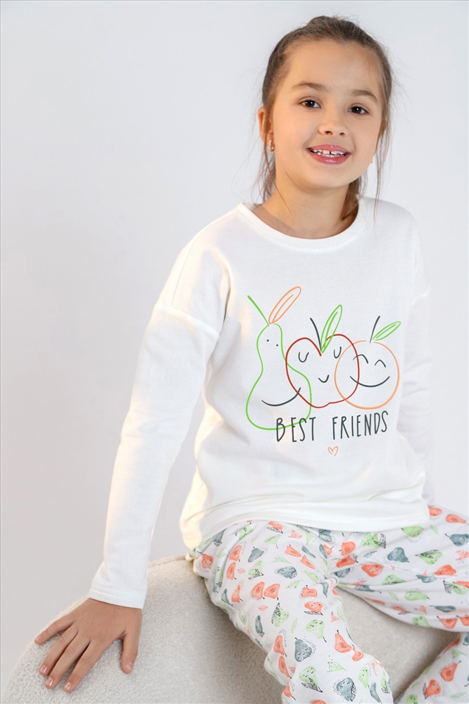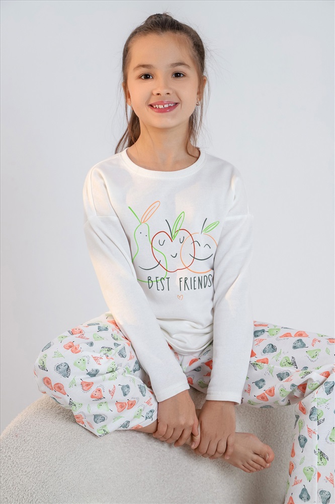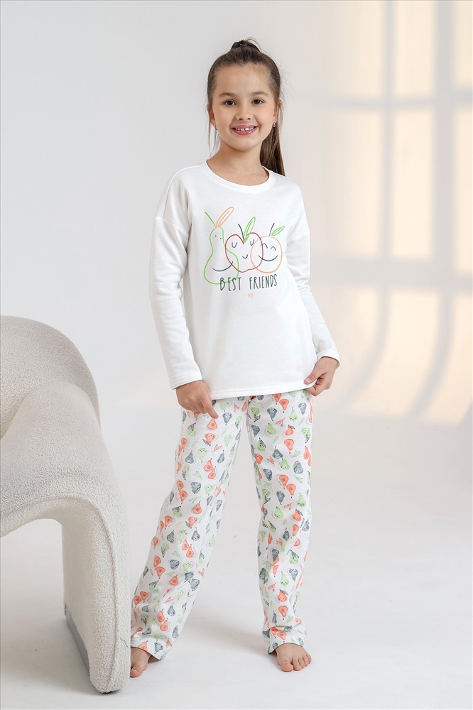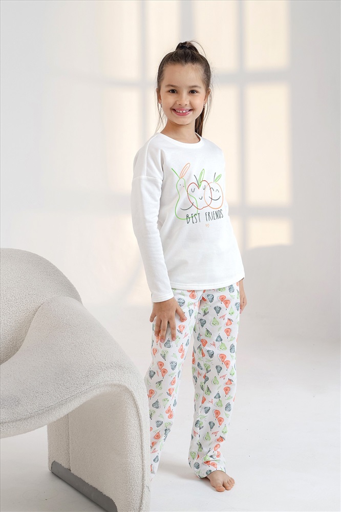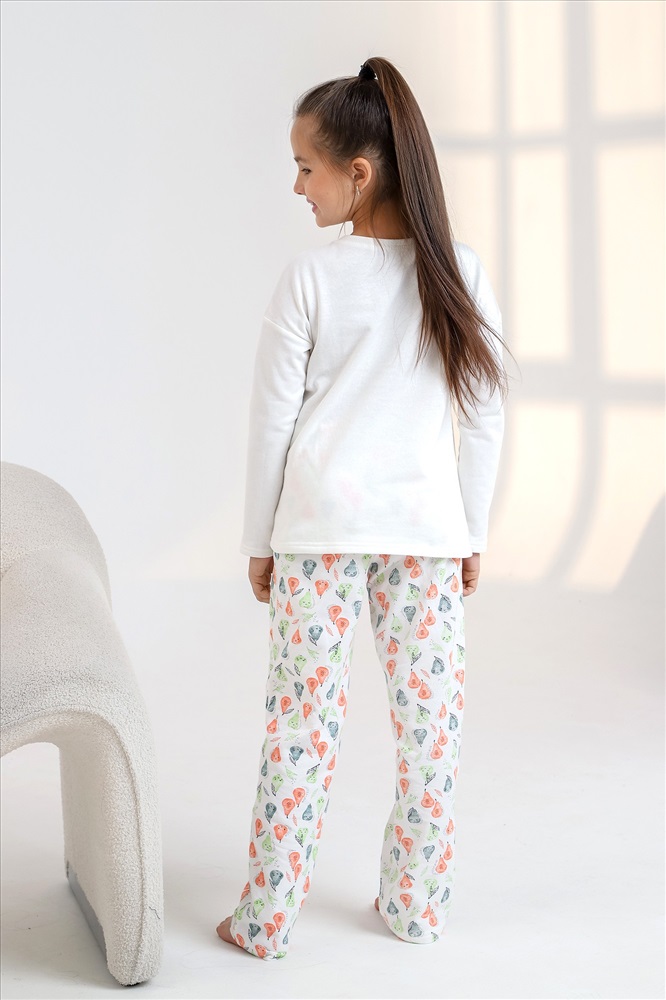 Пижама детская теплая. Джемпер однотонный, с принтом, спущенной линией плеч, длинными рукавами. Брюки на эластичной тесьме по линии талии.