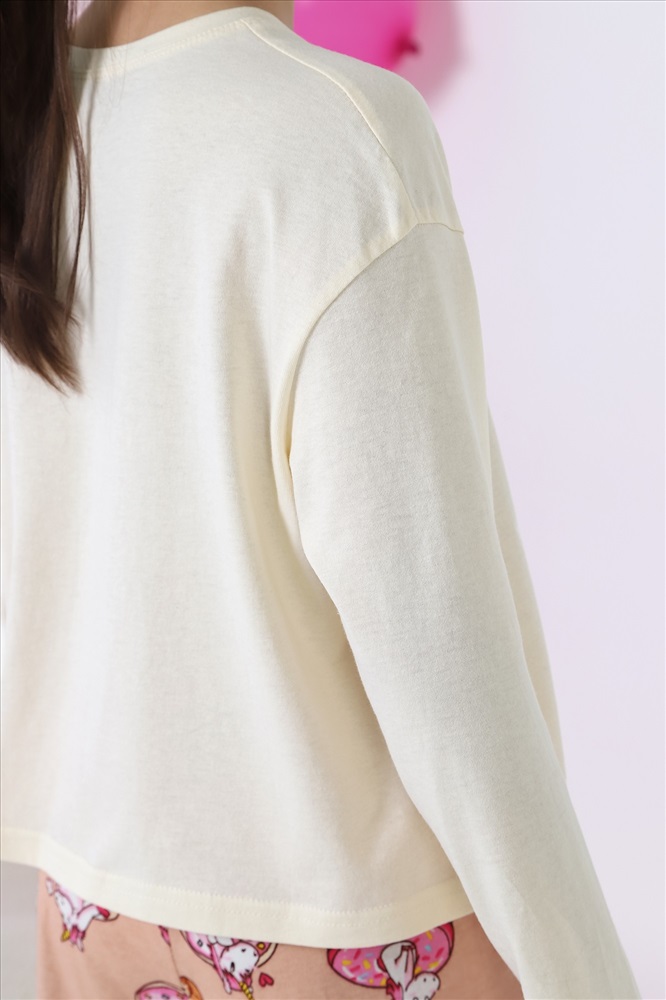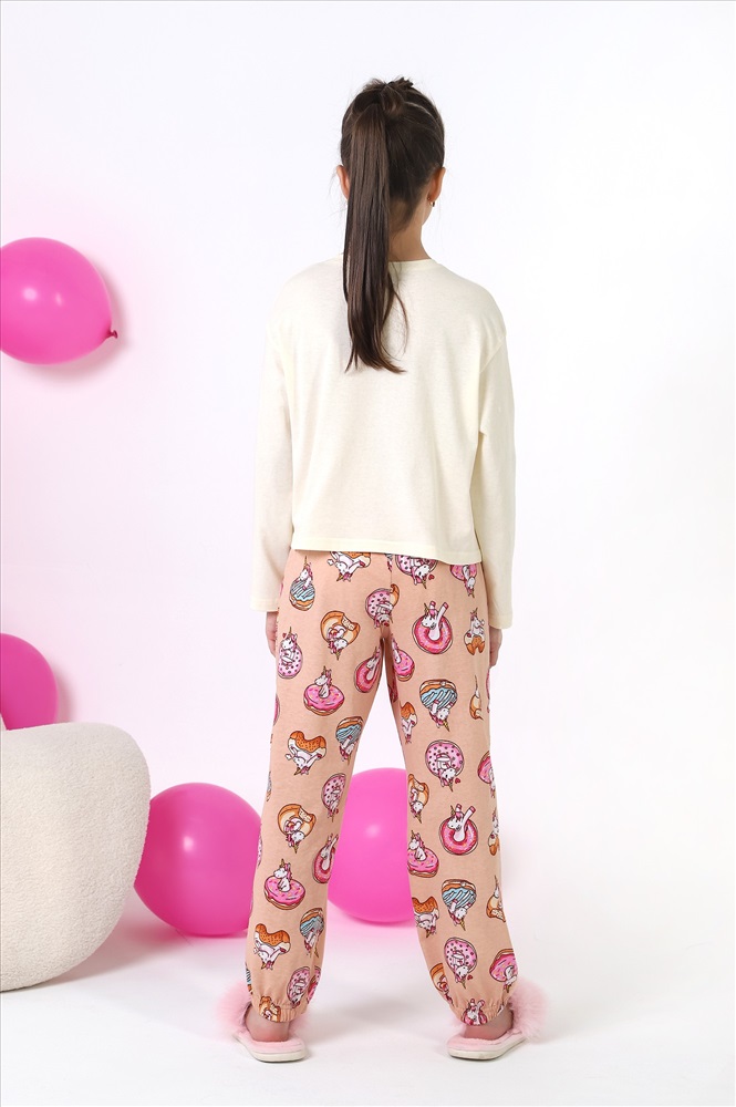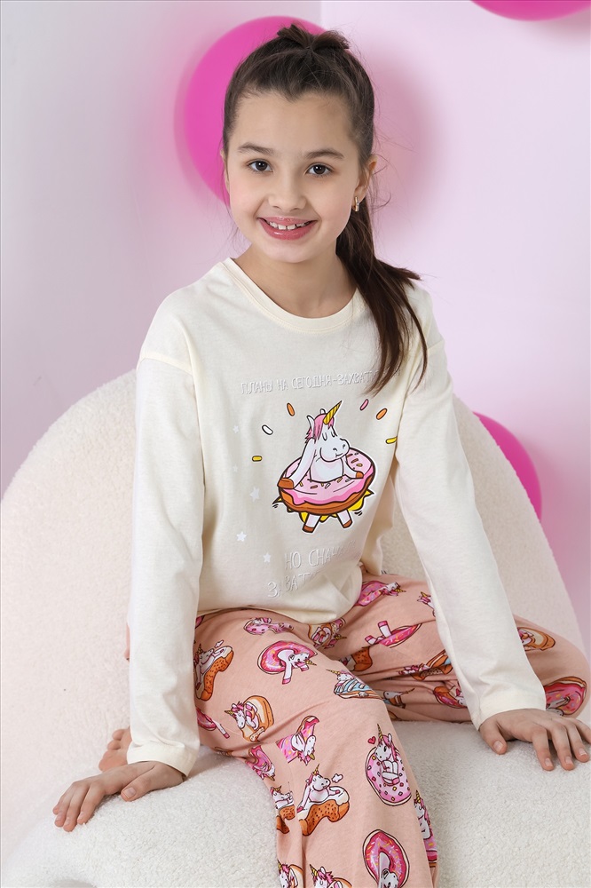 Пижама для девочки из трикотажного полотна "кулирка", состоящая из джемпера и брюк. Джемпер - из гладкокрашеного полотна, слега расширенный и укороченный, с втачными длинными рукавами, горловиной овальной формы, обработанной втачной планкой и принтом в центре переда, выполненным в технике шелкографии. Брюки из полотна с набивным тематическим рисунком, длинные, с эластичной тесьмой по талии и нижним срезами.