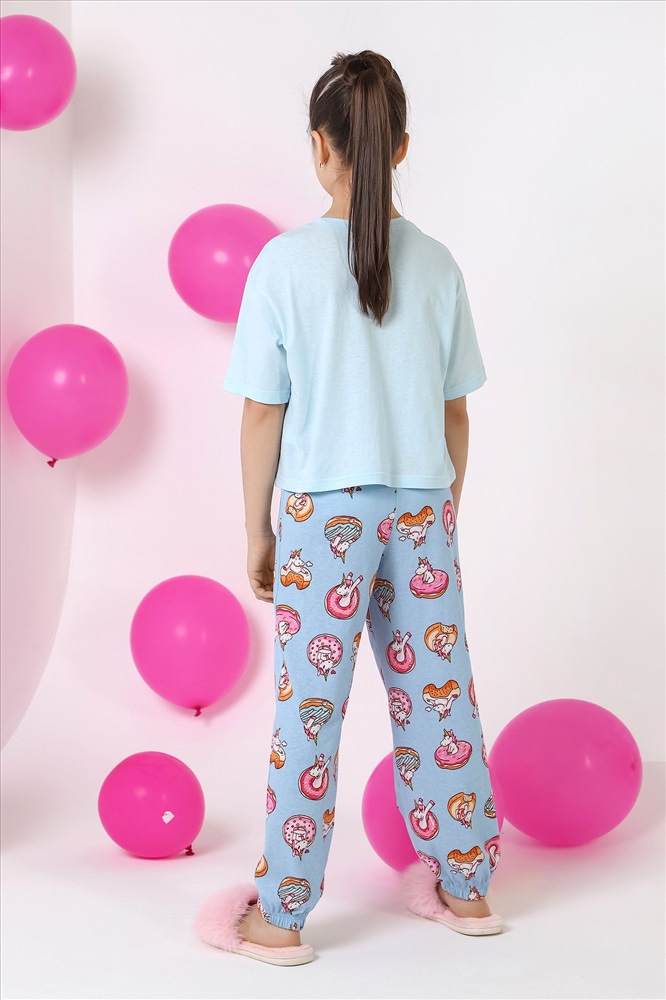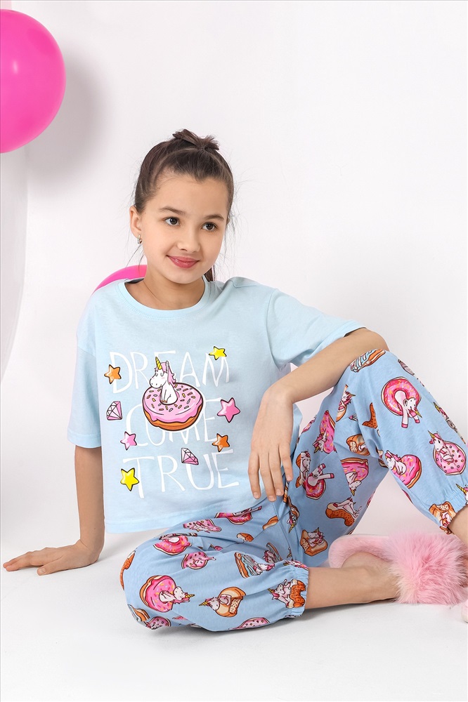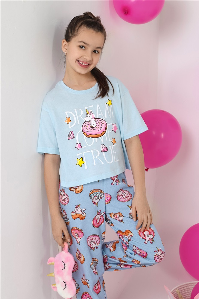 Пижама для девочки из трикотажного полотна "кулирка", состоящая из футболки и брюк. Футболка - из гладкокрашеного полотна, слега расширенная и укороченная, с втачными короткими рукавами, горловиной овальной формы, обработанной втачной планкой и принтом в центре переда, выполненным в технике шелкографии. Брюки из полотна с набивным тематическим рисунком, длинные, с эластичной тесьмой по талии и нижним срезами.