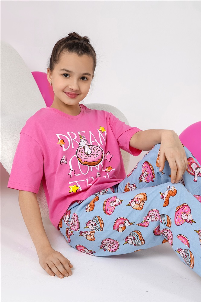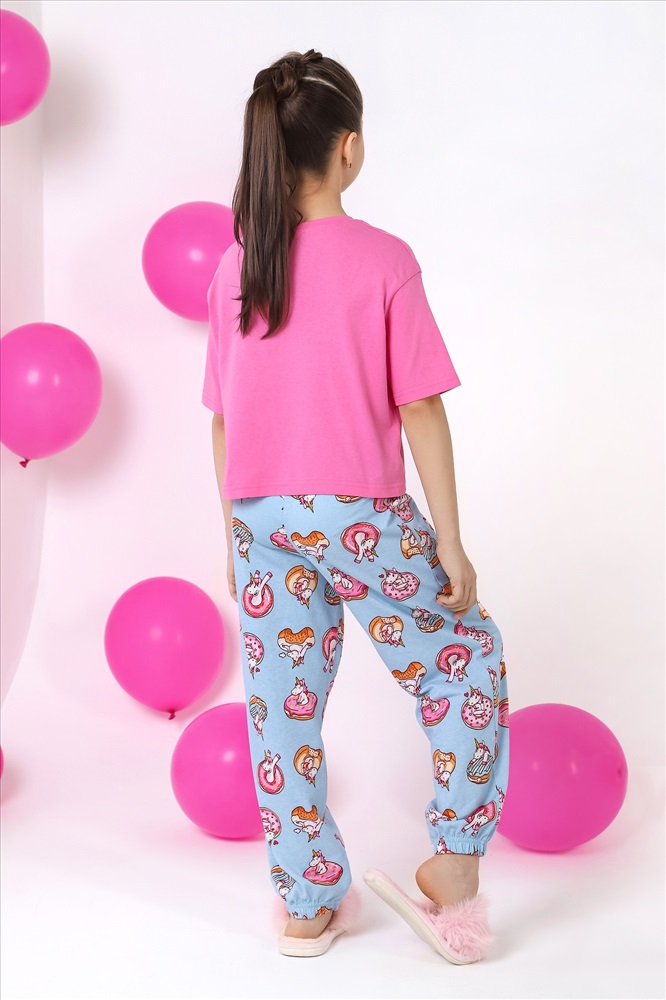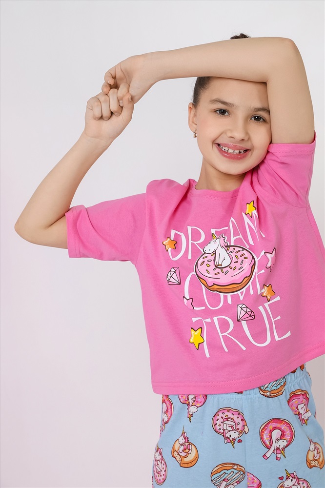 Пижама для девочки из трикотажного полотна "кулирка", состоящая из футболки и брюк. Футболка - из гладкокрашеного полотна, слега расширенная и укороченная, с втачными короткими рукавами, горловиной овальной формы, обработанной втачной планкой и принтом в центре переда, выполненным в технике шелкографии. Брюки из полотна с набивным тематическим рисунком, длинные, с эластичной тесьмой по талии и нижним срезами.