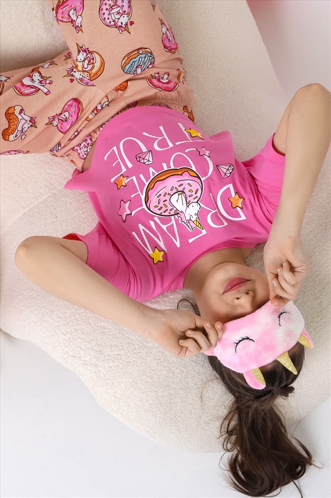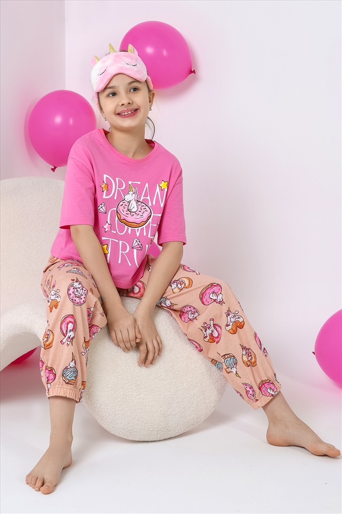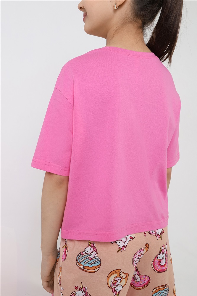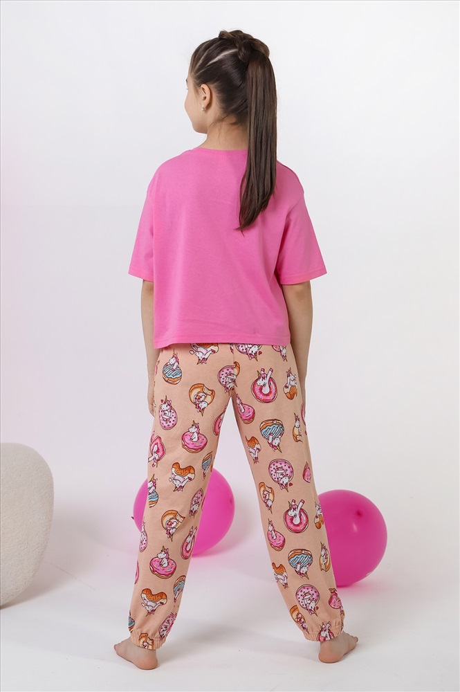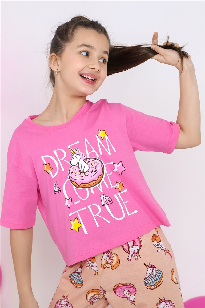 Пижама для девочки из трикотажного полотна "кулирка", состоящая из футболки и брюк. Футболка - из гладкокрашеного полотна, слега расширенная и укороченная, с втачными короткими рукавами, горловиной овальной формы, обработанной втачной планкой и принтом в центре переда, выполненным в технике шелкографии. Брюки из полотна с набивным тематическим рисунком, длинные, с эластичной тесьмой по талии и нижним срезами.