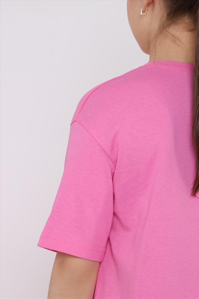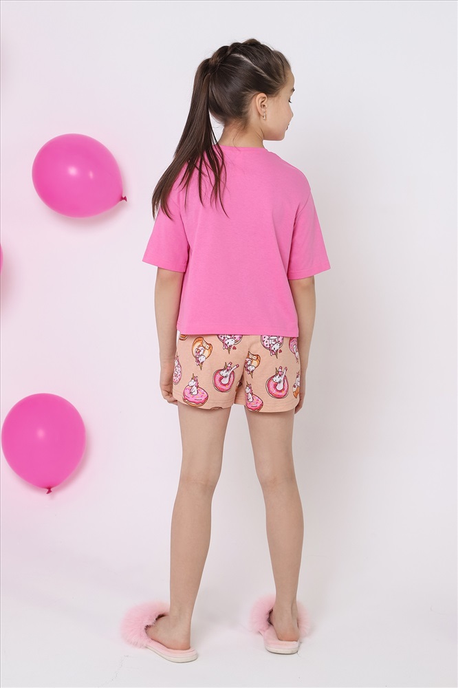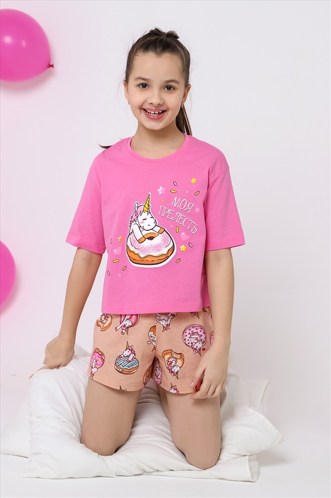 Пижама для девочки из трикотажного полотна "кулирка", состоящая из футболки и шорт. Футболка - из гладкокрашеного полотна, слега расширенная и укороченная, с втачными короткими рукавами, горловиной овальной формы, обработанной втачной планкой и принтом в центре переда, выполненным в технике шелкографии. Шорты - з полотна с набивным тематическим рисунком, средней длины, с эластичной тесьмой по талии.
