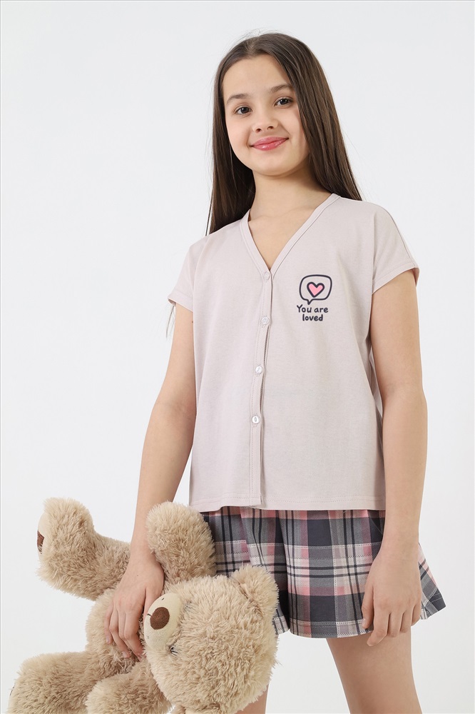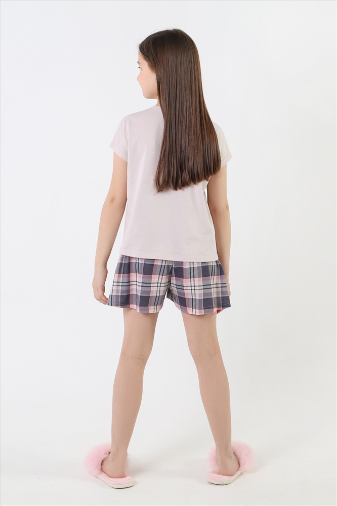 Пижама для девочки, состотящая из блузы и шорт. Блуза пижамная - из гладкокрашенного полотна "кулирка", свободжного покроя, с короткими цельнокроеными рукавами, V-образной горловиной и центральной бортовой застежкой на обметанные петли и пуговицы. В верпхней части левой полочки - принт, выполненный в технике шнлкографии. Борта и горловина окантованы основным материалом. Шорты - из полотна "кулирка" в клетку, расклешеные, короткие, с эластичной тесьмой по талии.