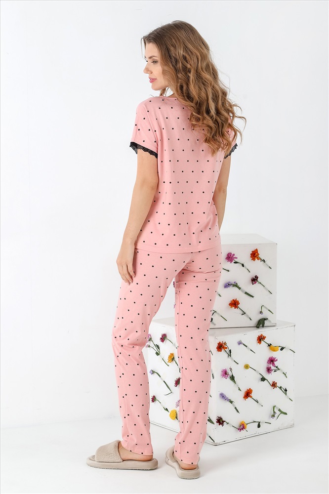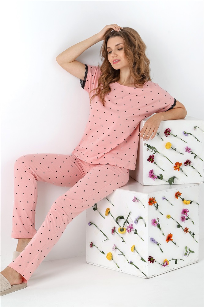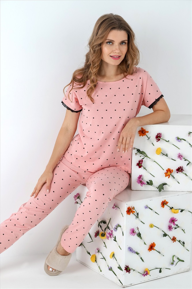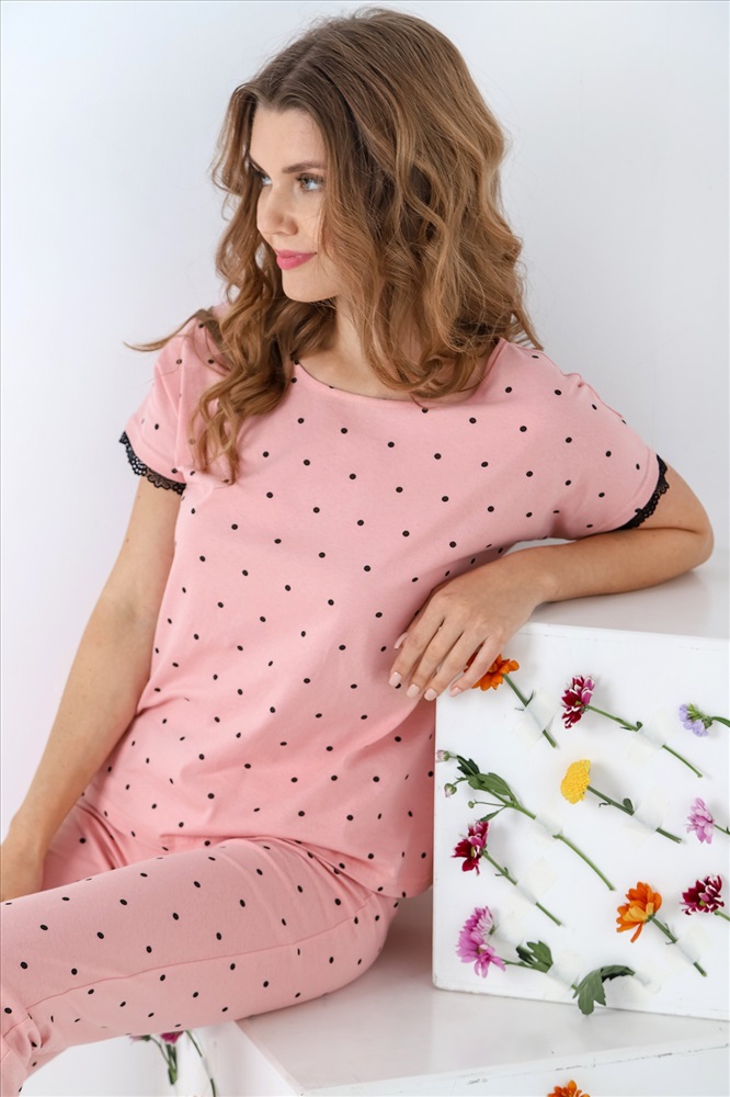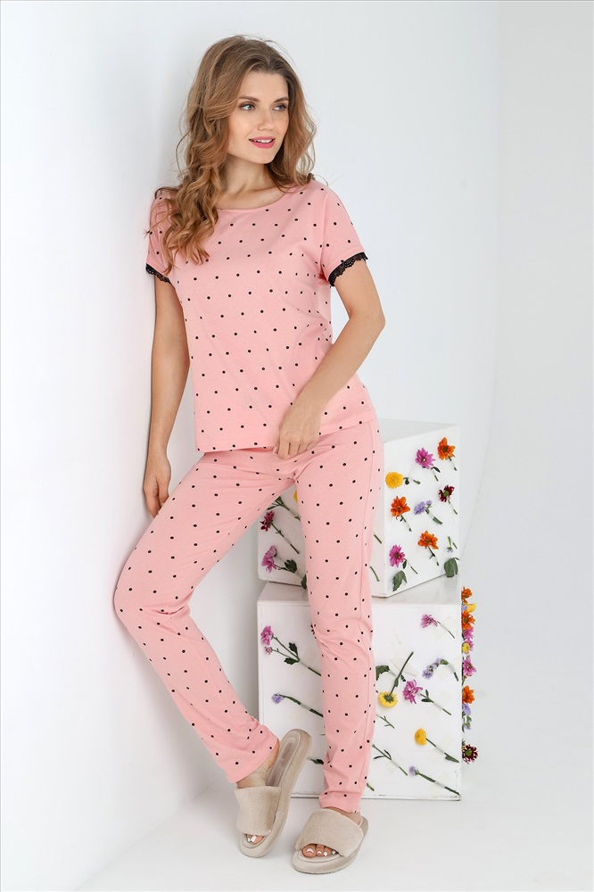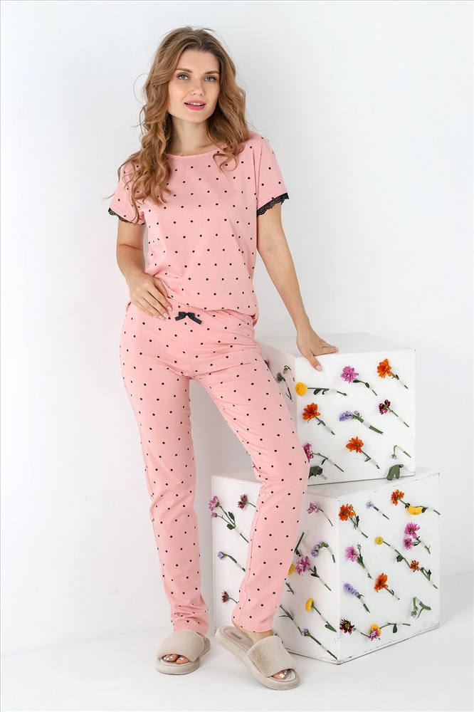 Ткань: Кулирка Кулирка - это самое гладкое и тонкое трикотажное полотно из чистого хлопка. С лицевой стороны ткань «кулирка» выглядит как «вертикальные косички», орнамент изнаночной стороны напоминает «кирпичную кладку». Свойства кулирного трикотажа- воздухопроницаемость, гигроскопичность, не теряя своей формы, практически не тянется в длину и хорошо растягивается в ширину, не образует складки. Пижама молодежная из трикотажного полотна «кулирка» с набивным рисунком, состоящая из футболки и брюк.